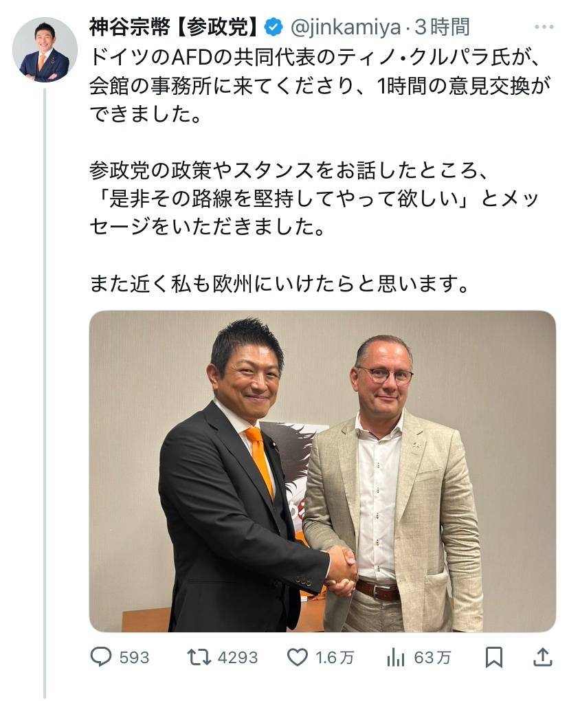 神谷宗幣さん、ドイツの極右政党と笑顔で握手www