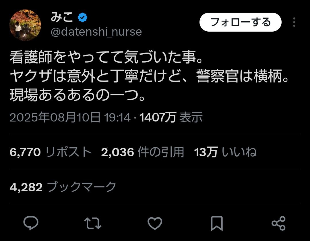 Twitter女さん「看護師してたら分かることだけど、警官はクズばかりでヤクザは丁寧で優しい。」←1407万いいねabeabeabeabeabeabeabeabeabeabeabeabeabe