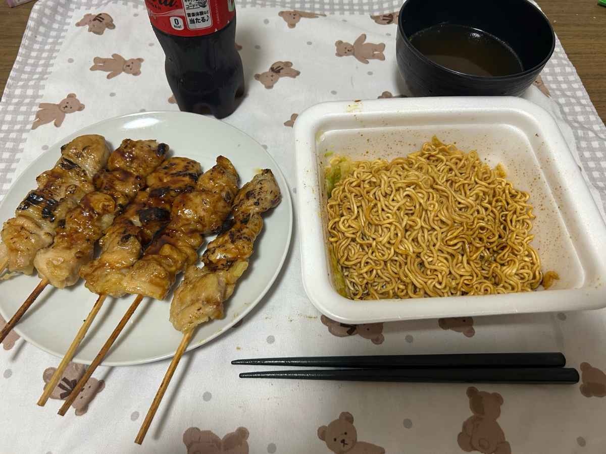 カップ焼きそばと半額の焼き鳥🥺