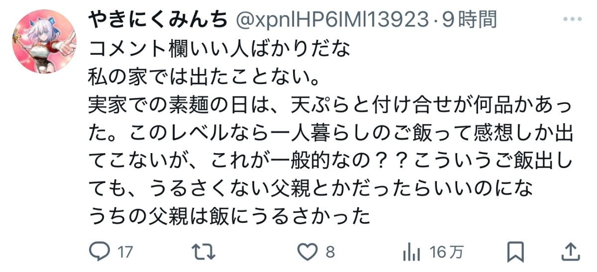 そもそも日々の飯の献立考えて買い物するのって意外としんどいけど、なら尚更そうめんの日は楽やと思うけどな - 29 名前:ここからは表現の自由でイカせていただきます 投稿日時:2025/08/14(木) 02:25:22.579 ID:QNtGbr5TH