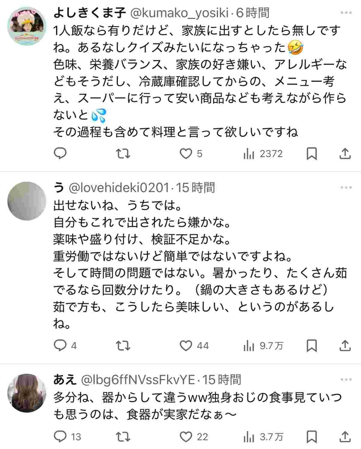 - じゃあ実はこれXで発狂してる層は滅茶苦茶凝った料理する主婦だったりするんか?
