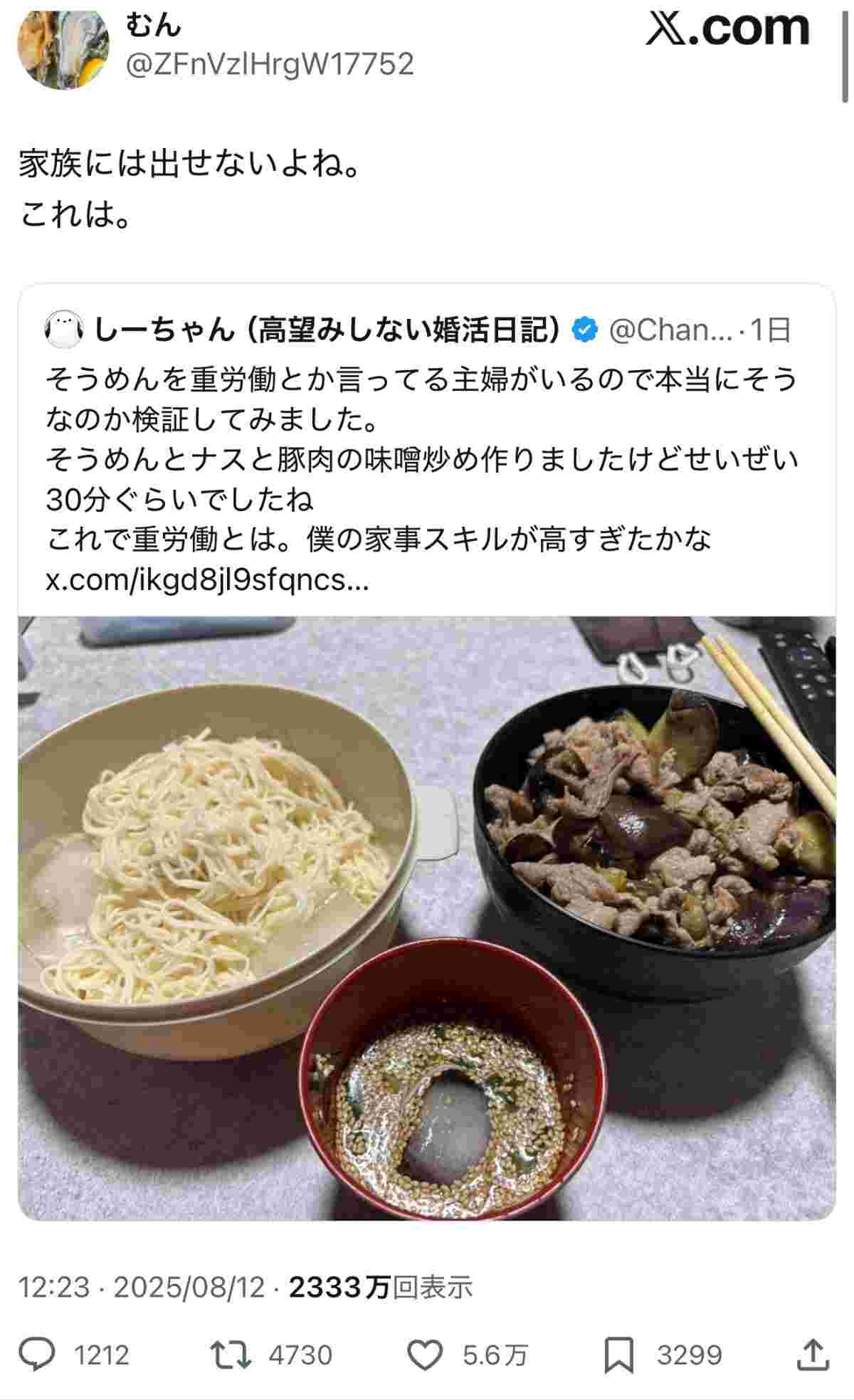 毎食そんな気合入れて作らなきゃいけないって思ってんならなんか文句言いたくなるのもわかる気がする - 292 名前:ここからは表現の自由でイカせていただきます 投稿日時:2025/08/14(木) 02:58:05.258 ID:tDlicOqiX