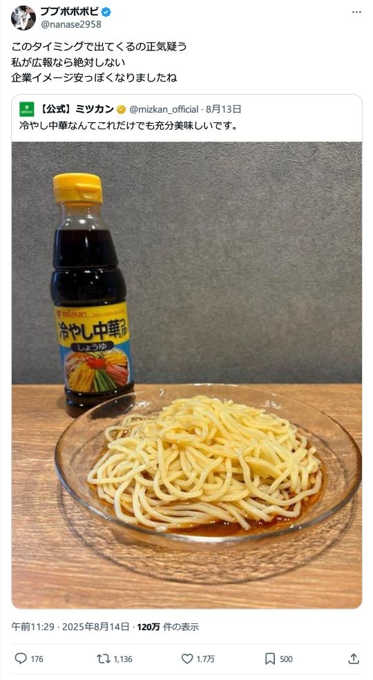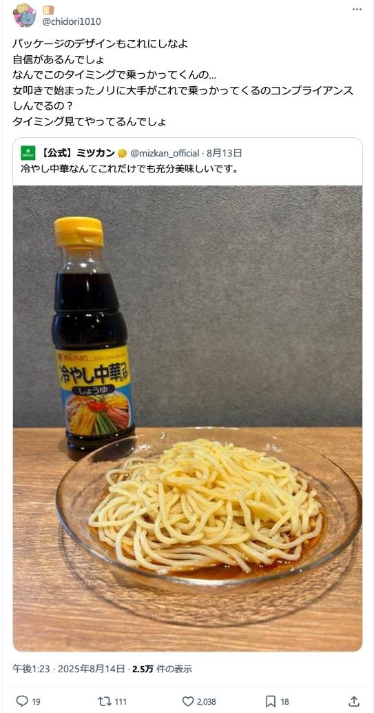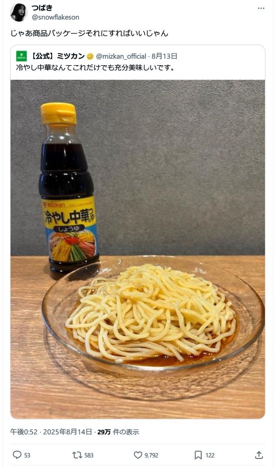 【画像】ミツカン「冷やし中華なんか、これでいいんだよ」女性「じゃあパッケージそれにすれば?」ミツカン「…(押し黙る)」