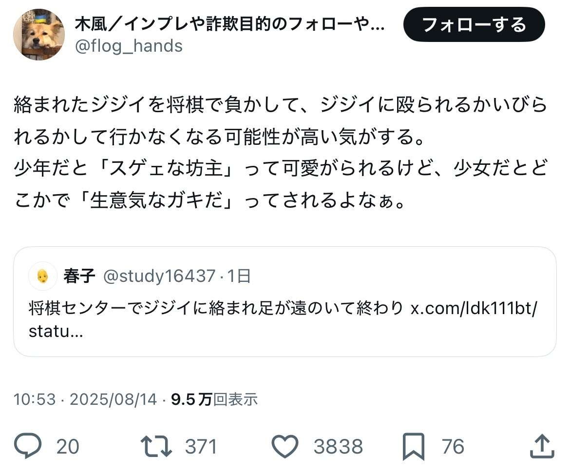 だって人生かけて将棋やってる女さんいないし… - 97 名前:ここからは表現の自由でイカせていただきます 投稿日時:2025/08/15(金) 12:16:32.248 ID:497txG9TJ