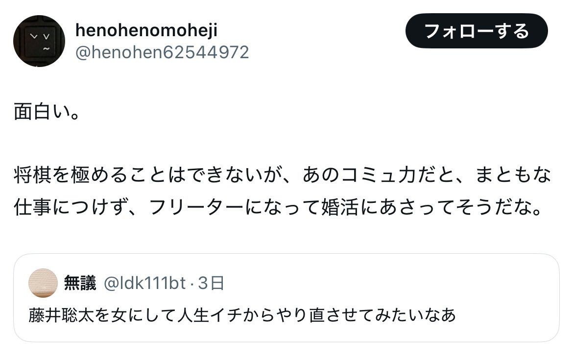 女性「藤井聡太さ、お前さ、女に生まれてたら絶対将棋なんて極められてないからな」←正論すぎて213万いいねwww