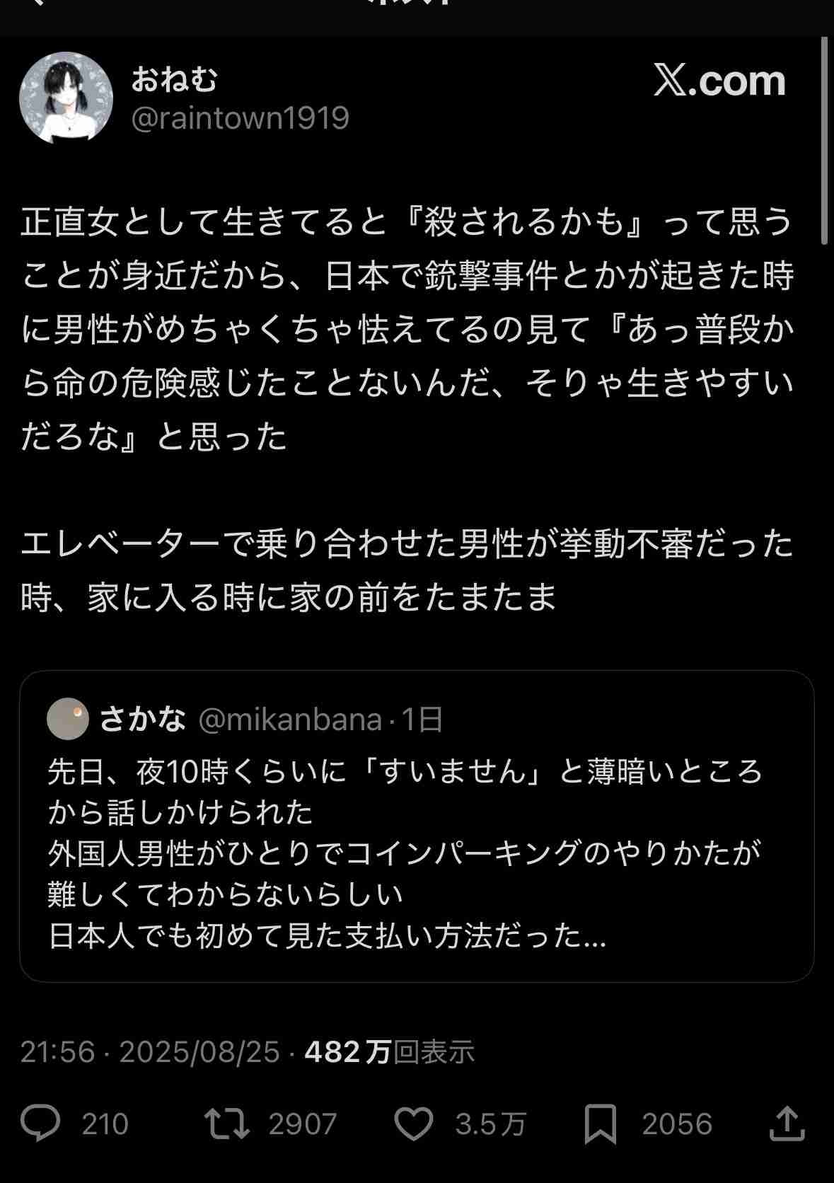 ワイは男やが夜に人気のない路地とか歩けないが女の場合あの感覚が町中まで広がるわけやろ - 12 名前:ここからは表現の自由でイカせていただきます 投稿日時:2025/08/26(火) 19:54:49.662 ID:fJvLBxwau