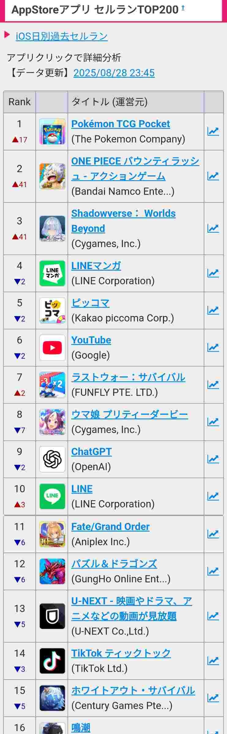 ポケポケ、シャドバ、ワンピースあるから一桁無理だとしても下がるってことはないやろせめて一つはあがるだろ?