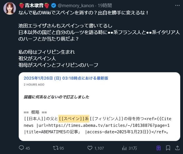 普通の日本人と違って白人の血が混じってるのは確定だからな - 48 名前:ここからは表現の自由でイカせていただきます 投稿日時:2025/08/29(金) 06:24:25.043 ID:1RN65TNEL