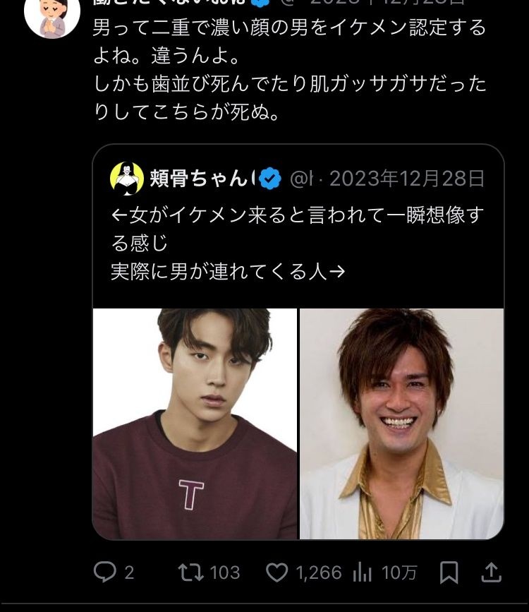 塩系とか堀りが深いの話やなくてただの若者とおっさんの比較なんだよねこれ