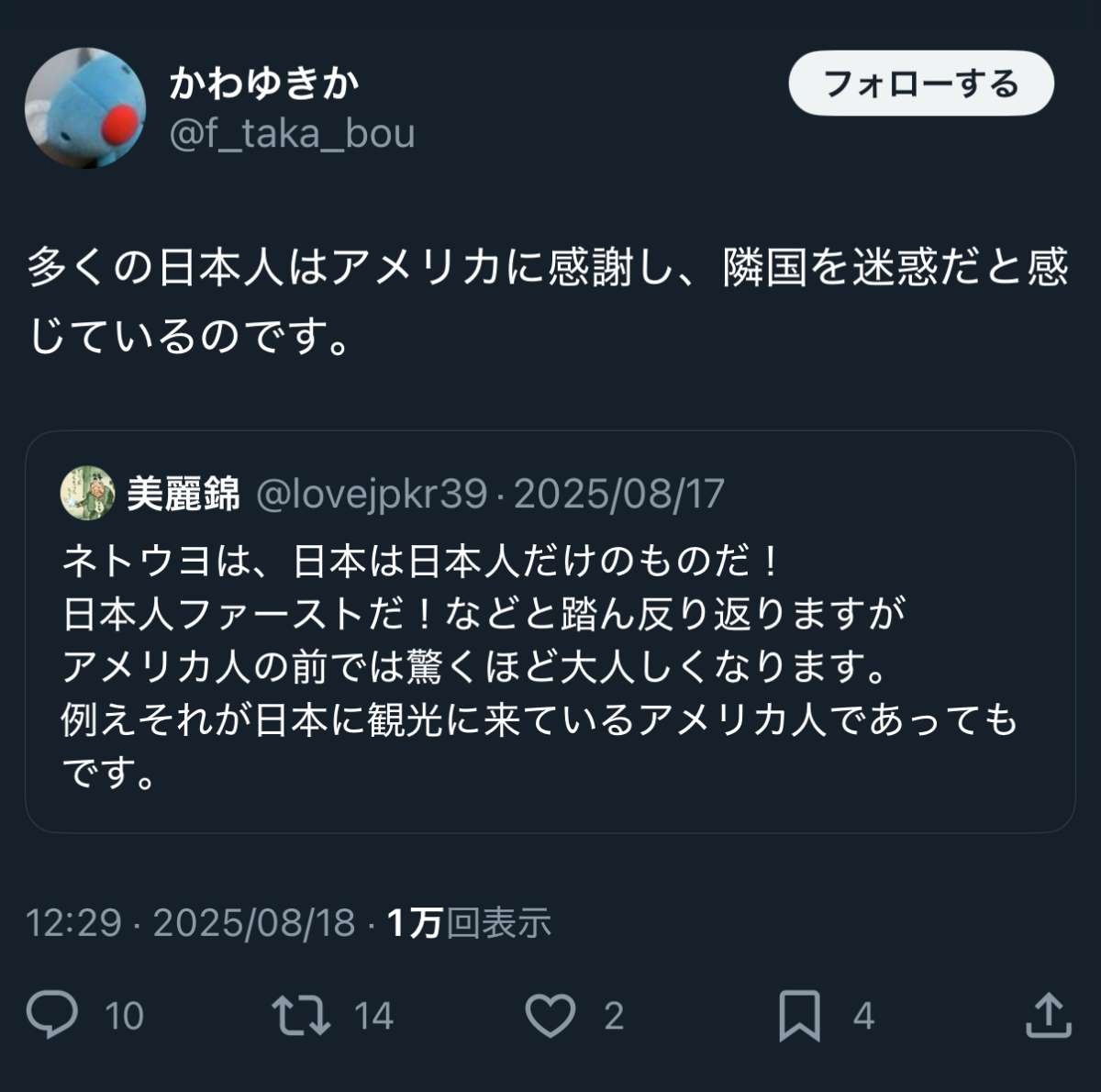 - ってかこいつら真面目になんでクルドやら中国人やら韓国人は叩くのにアメリカ人はスルーなん??