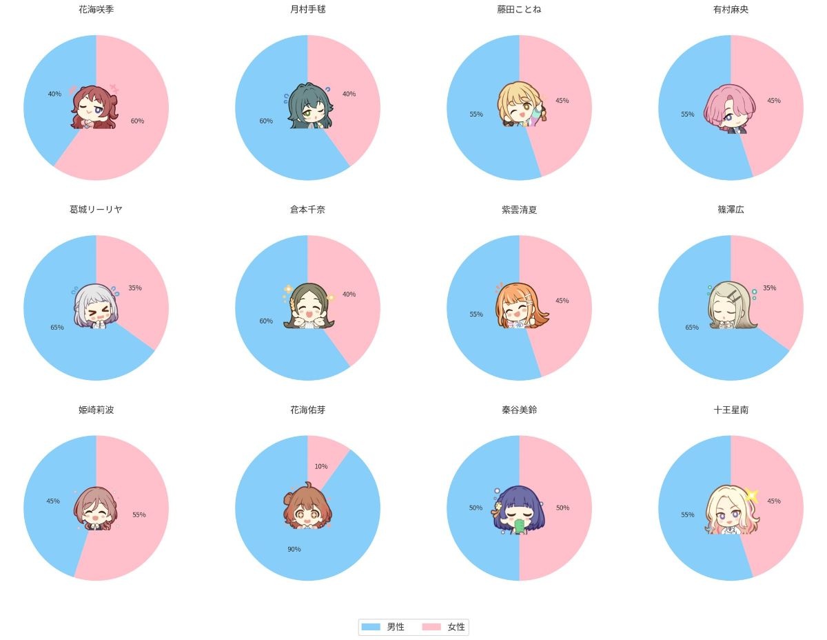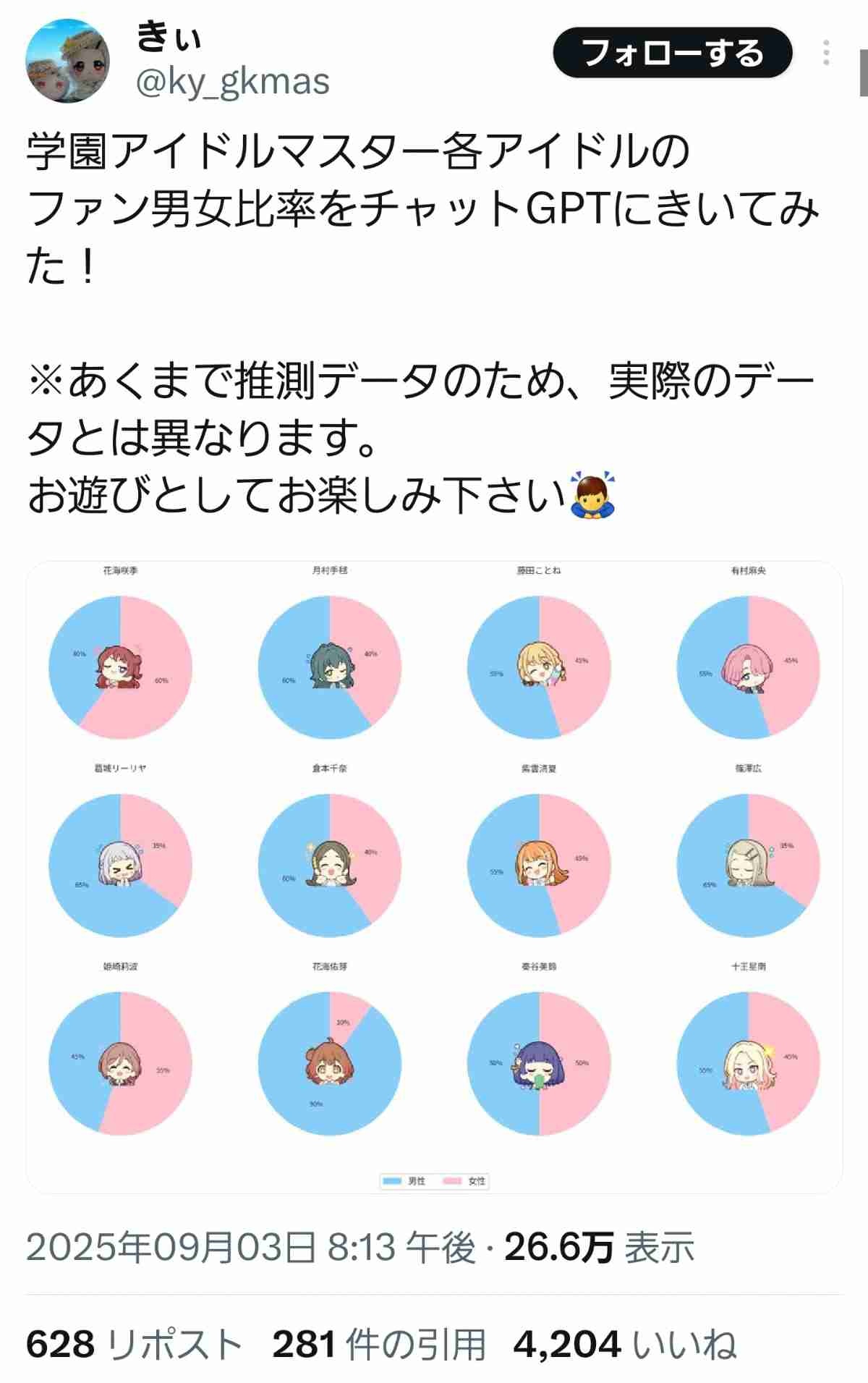 𝕏民「学園.アイドルマスター各アイドルのファン男女比率をチャットGPTにきいてみた!」