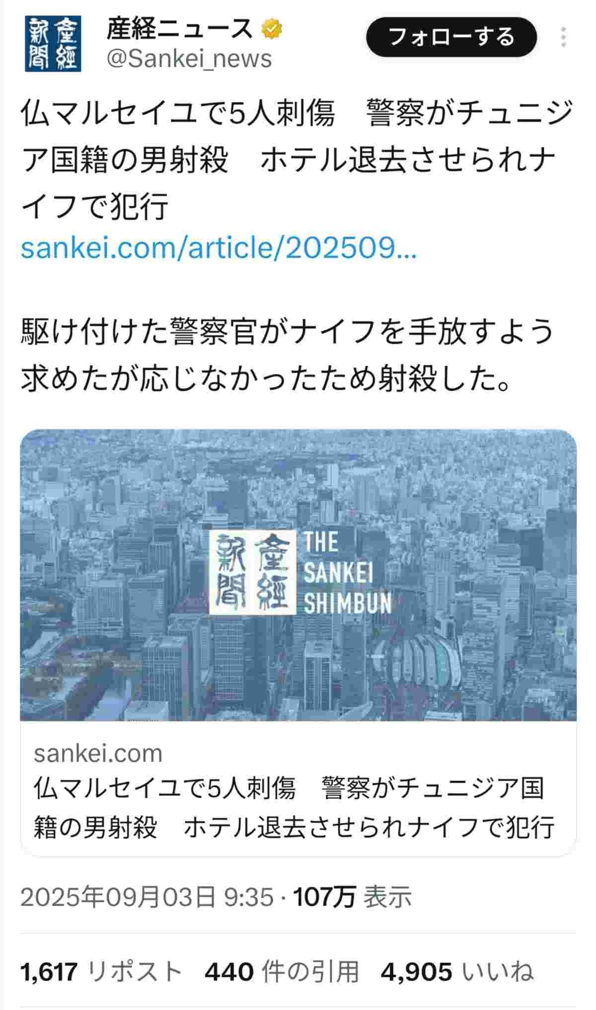 チュニジアから来て困っている人をホテルから追い出さなければ誰も刺す必要はなかった! - 30 名前:ここからは表現の自由でイカせていただきます 投稿日時:2025/09/04(木) 19:41:03.655 ID:Zd0OYwmP4