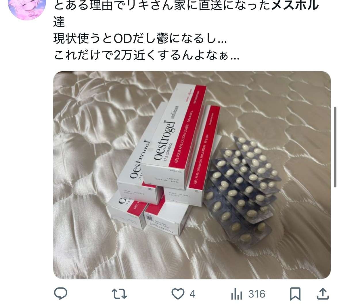 - 薬融通したりメスホルコミュニティできてて神ですよ