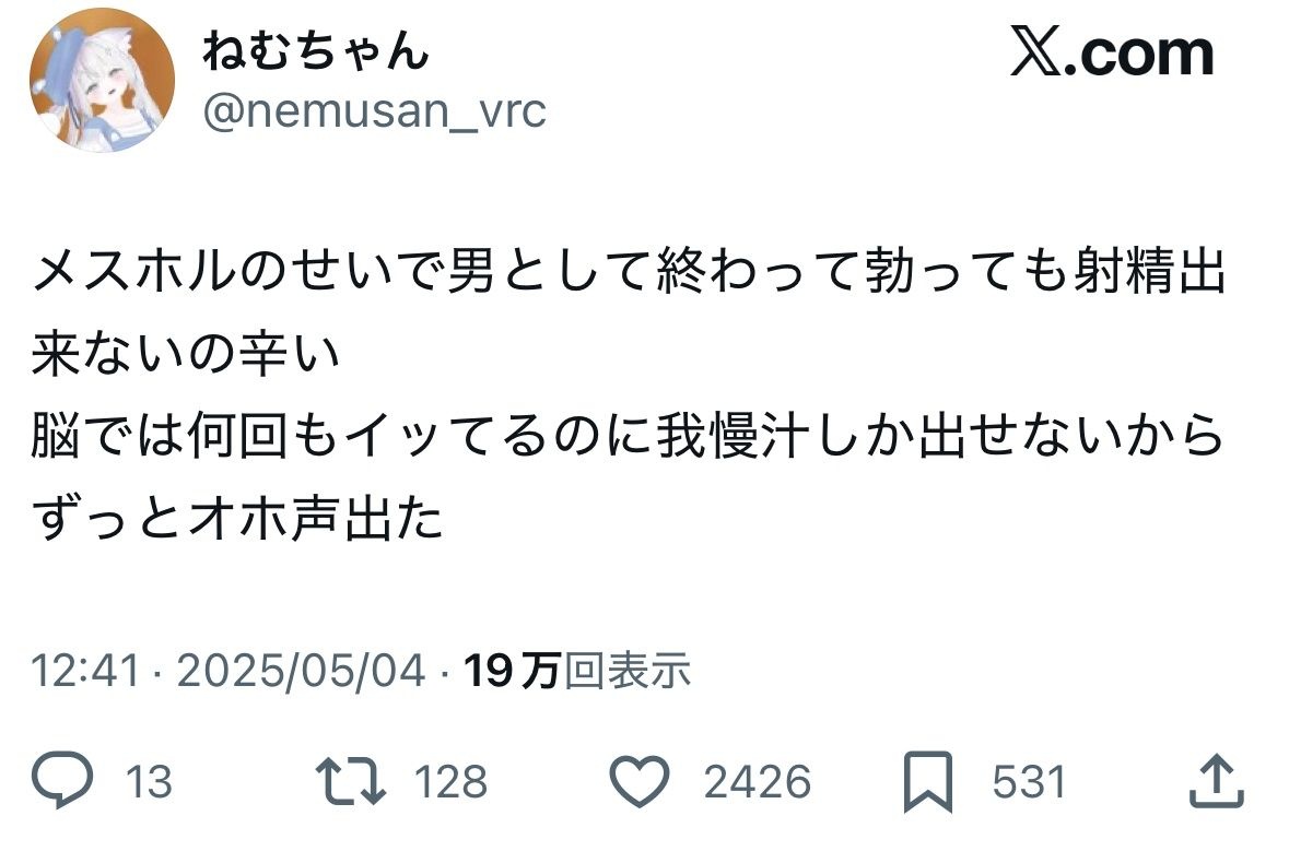 VRCがメスホル摂取するかわいいガチ男の娘量産してて神すぎる - 19 名前:ここからは表現の自由でイカせていただきます 投稿日時:2025/09/08(月) 03:11:50.096 ID:mlIE58HIM