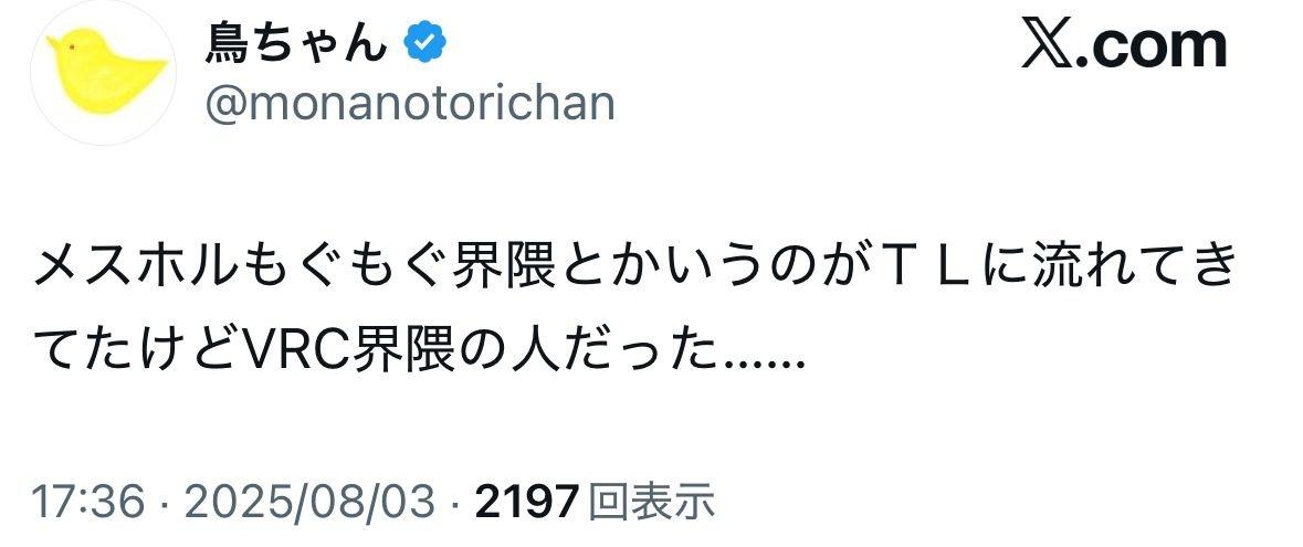 以前から目覚めてたけど現実ではメスになりきれないからVRCに来たのもいるやろし - 18 名前:ここからは表現の自由でイカせていただきます 投稿日時:2025/09/08(月) 03:11:43.531 ID:VlwnsnqWP