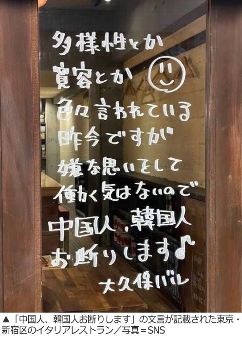 新宿区に 韓国人お断り の飲食店 弁護士「これは人種差別 人種差別は法律違反 人種差別反対」