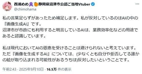 沼津市公認Vtuber「生成AIを利用し『クリエイターを軽視する地元商店』は距離を置かせていただきます」発言が物議