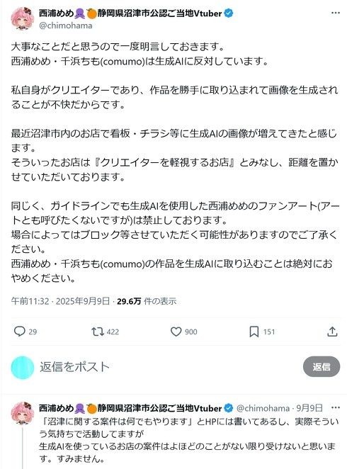 - 画像生成AIを利用する店は「クリエイターを軽視する店」と見なし、距離を置く――静岡県沼津市公認のVTuberである西浦めめさんの発言が物議を醸している。西浦さんは9月9日、自身のXアカウント(@chimohama)で「生成AIに反対している」との声明を発表。声明を巡り、沼津市にも見解を聞いたところ「市の見解ではない」との回答が得られた。