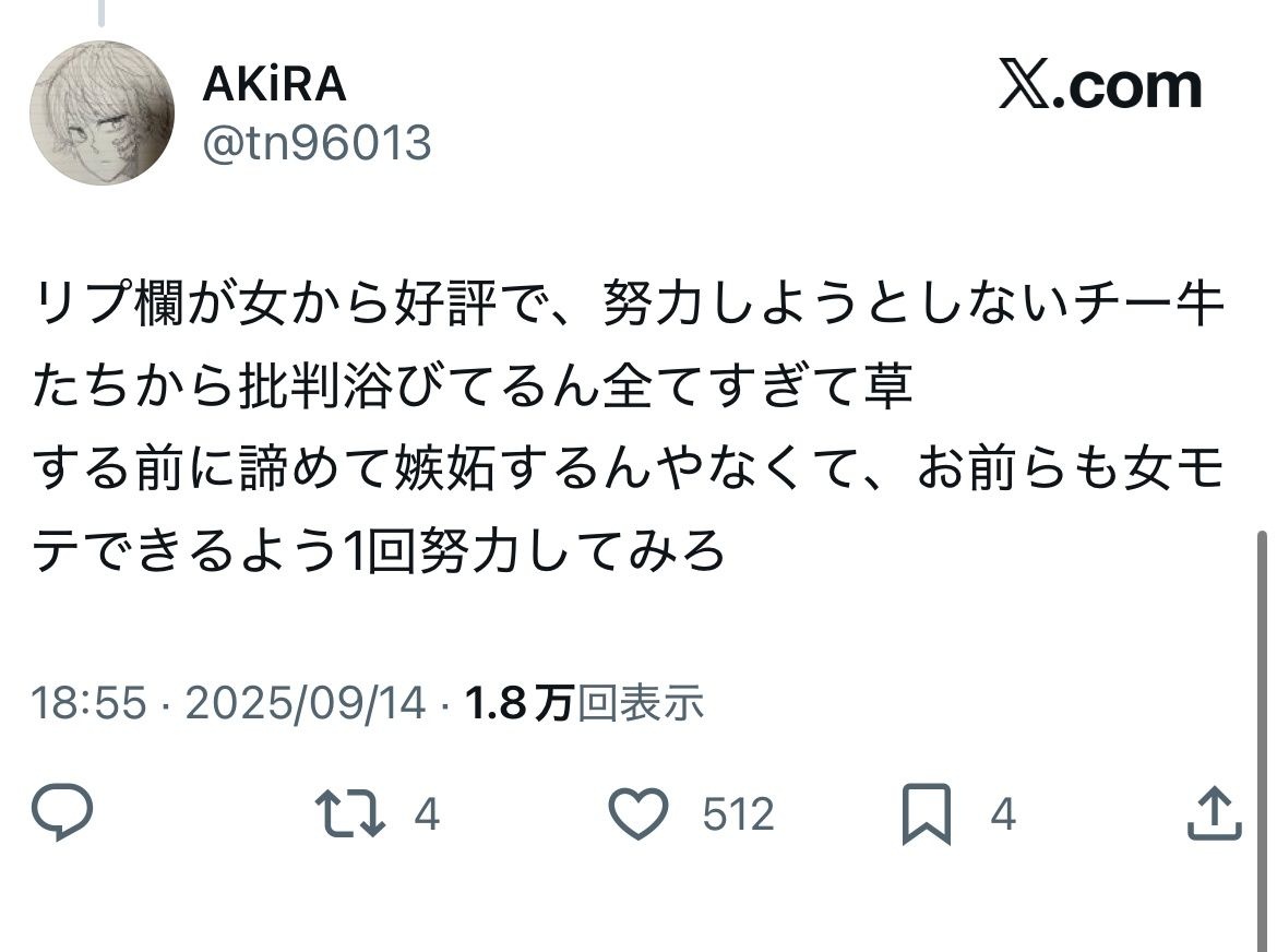 - 18 名前:ここからは表現の自由でイカせていただきます 投稿日時:2025/09/15(月) 05:44:10.114 ID:WIWmYNZ23