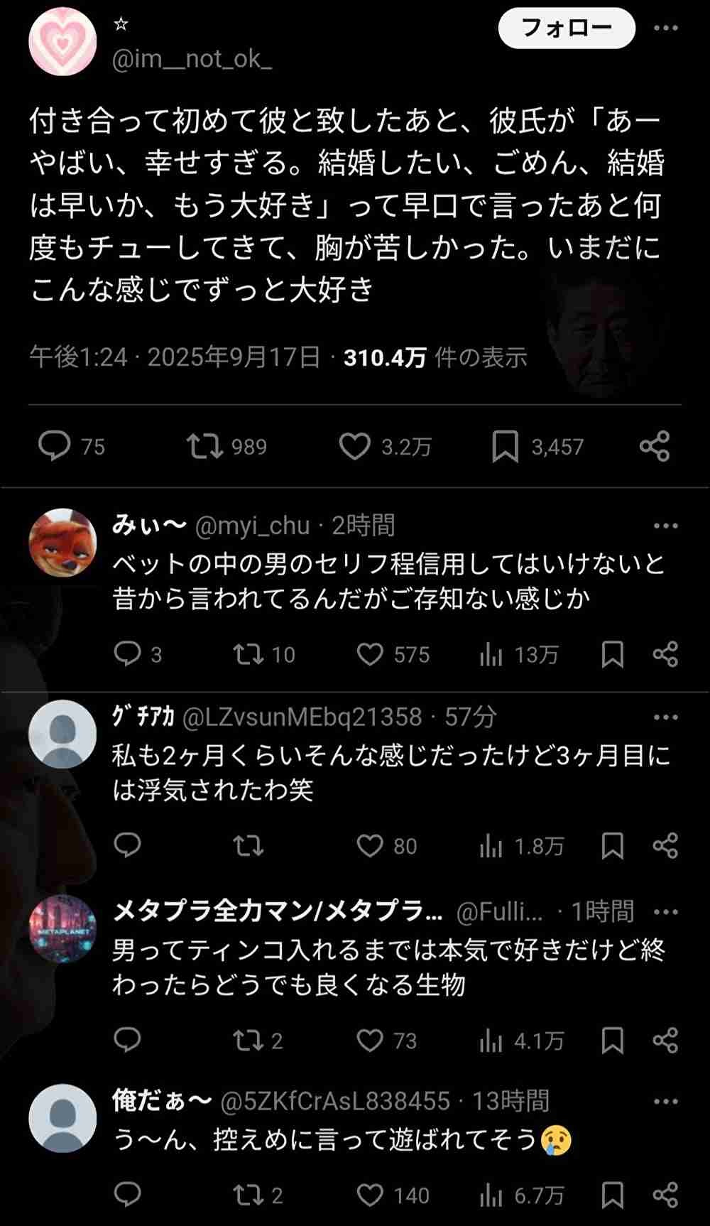 男が浮気相手に本気になることはまずないし本命が彼女なのは変わらへん - 48 名前:ここからは表現の自由でイカせていただきます 投稿日時:2025/09/18(木) 15:56:42.201 ID:MlGlgnIkK