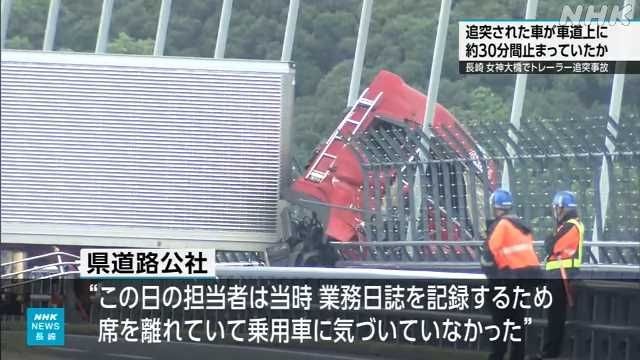 長崎市の女神大橋でトレーラーが乗用車に追突し、トレーラーの運転手が死亡した事故で、追突された乗用車が駐停車禁止の車道上におよそ30分間、止まっていたことがわかりました。
