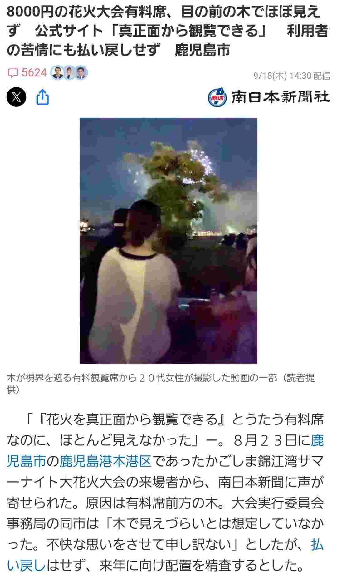 20代女性「花火大会有料席(8000円)から花火見えない。返金してください」→鹿児島市役所「無理です」