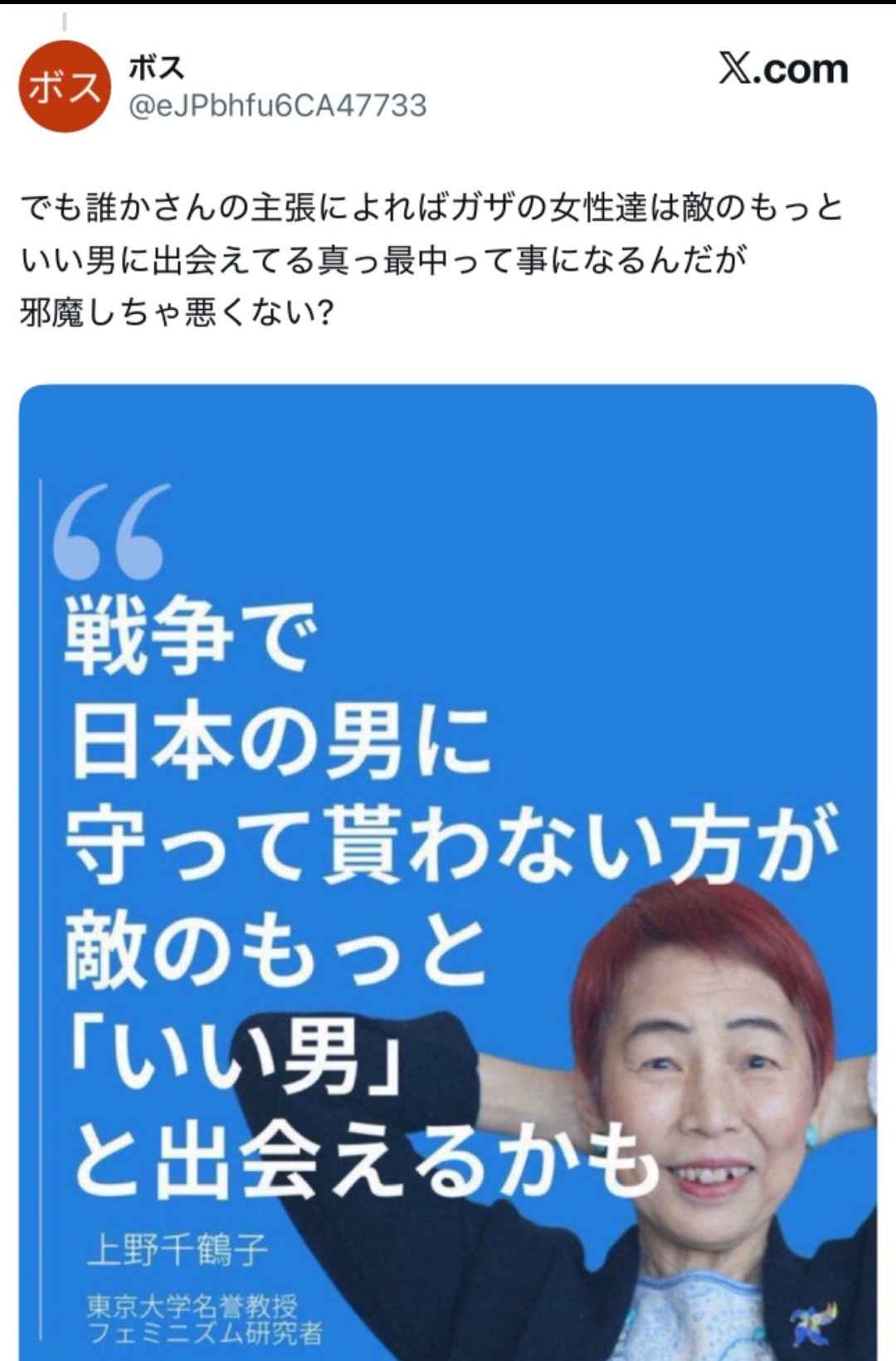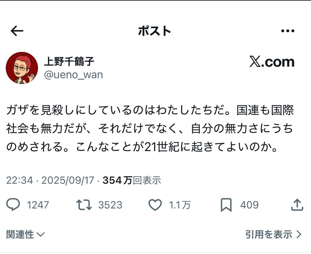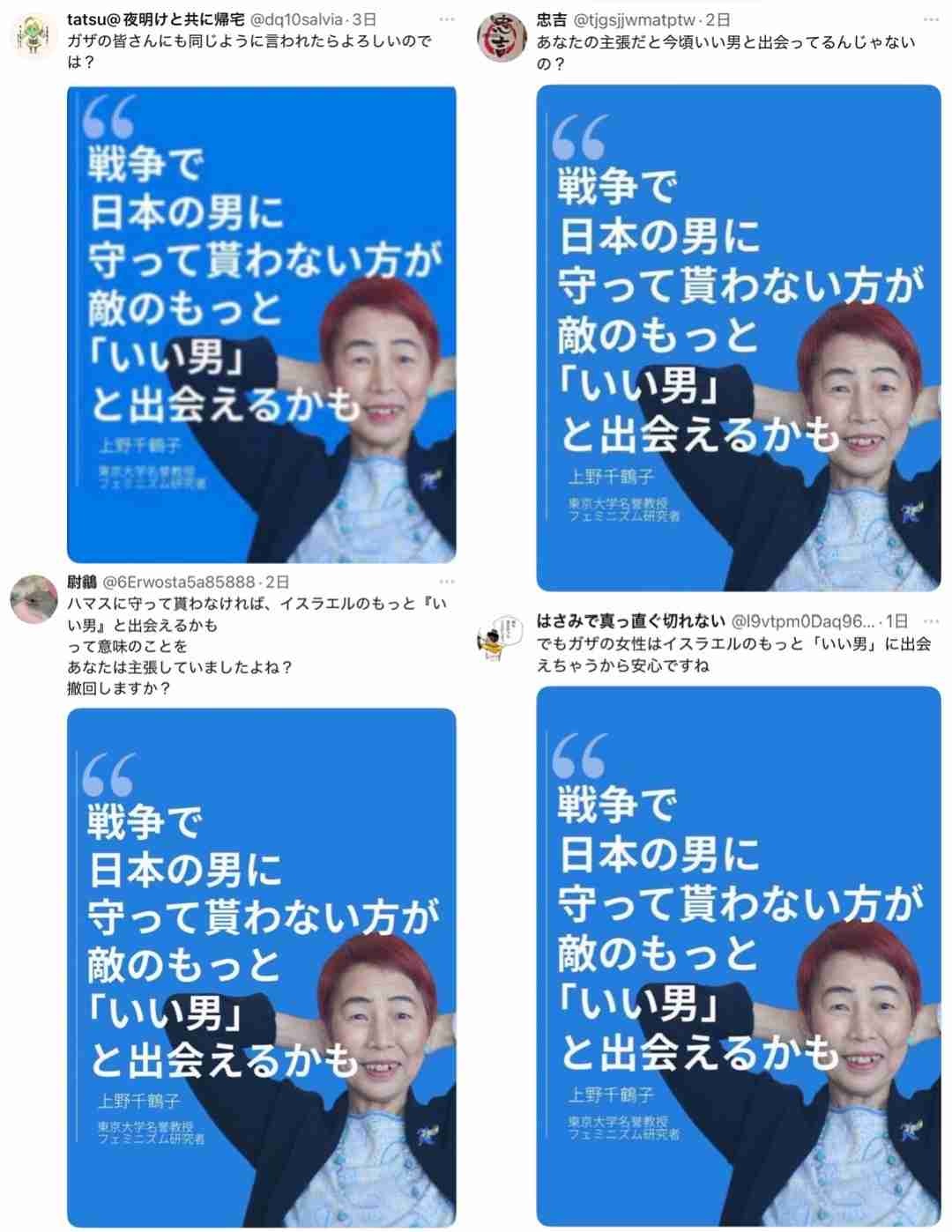 フェミニスト上野千鶴子さん、ガザの虐殺に心を痛め日本社会を批判するも過去の自分に後ろから刺される