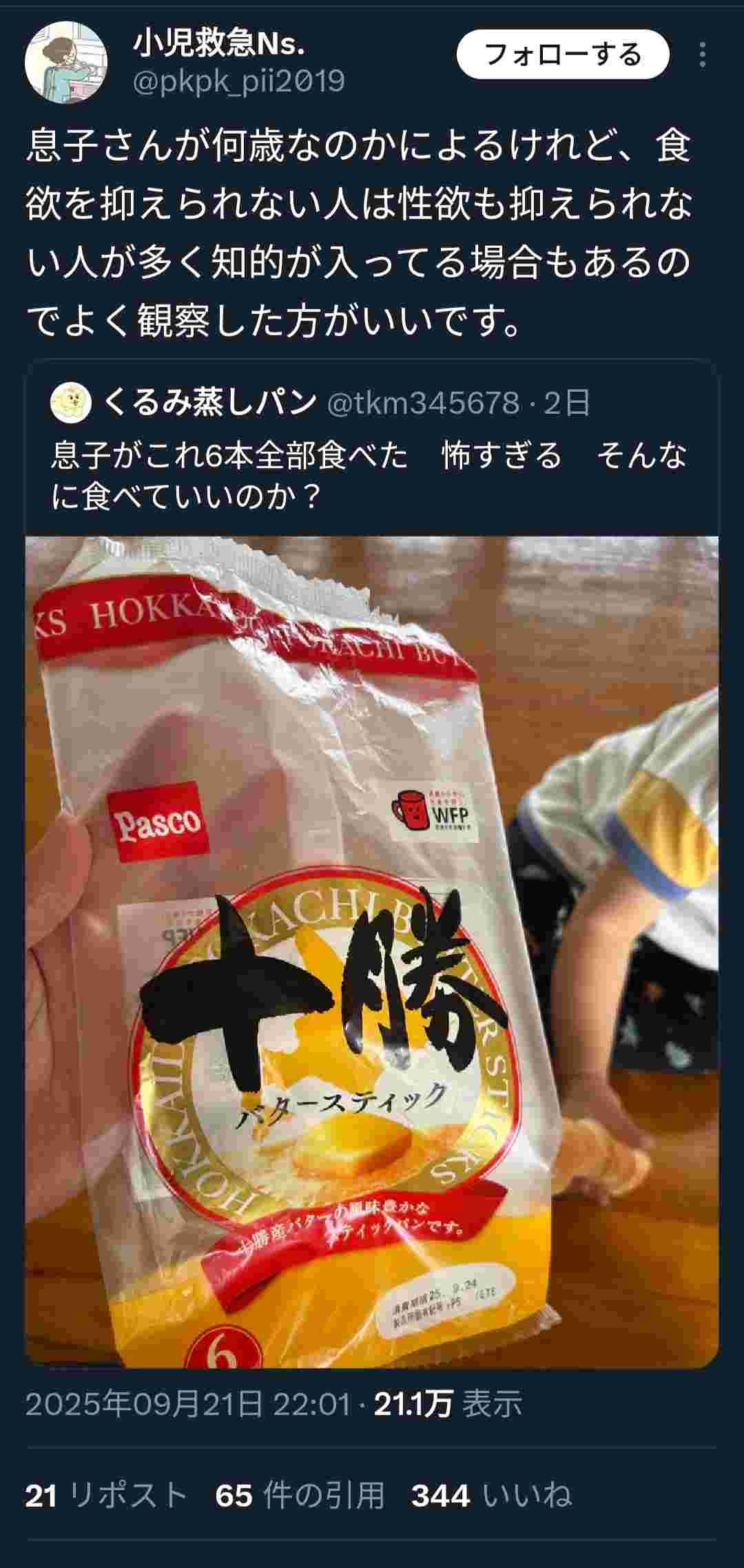 「息子がスティックパン6本も食べちゃった」→ナース「食欲も性欲も制御できないゲェジの可能性が高いですね」