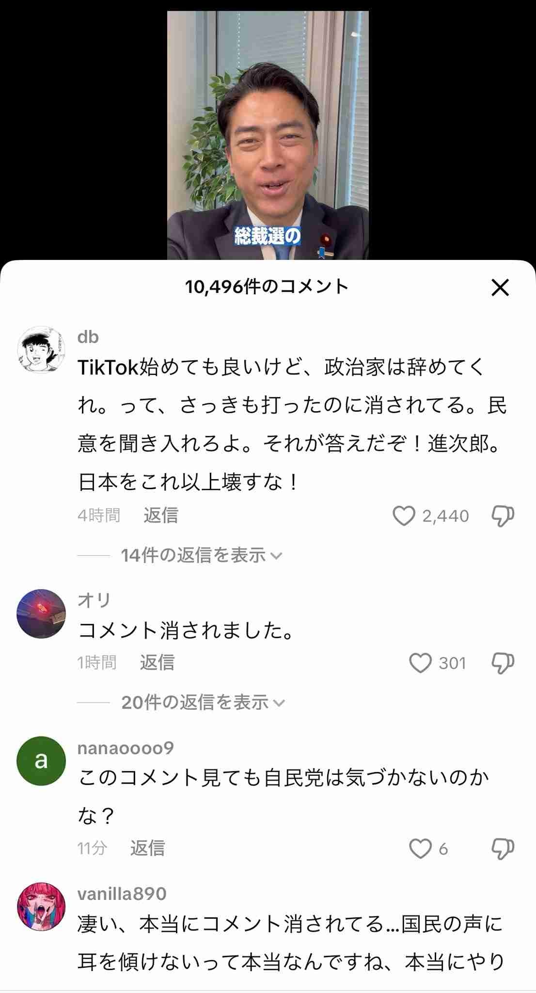 小泉進次郎さん、進さん化が加速。公式Tiktokの批判コメントを削除して印象操作してしまうwww