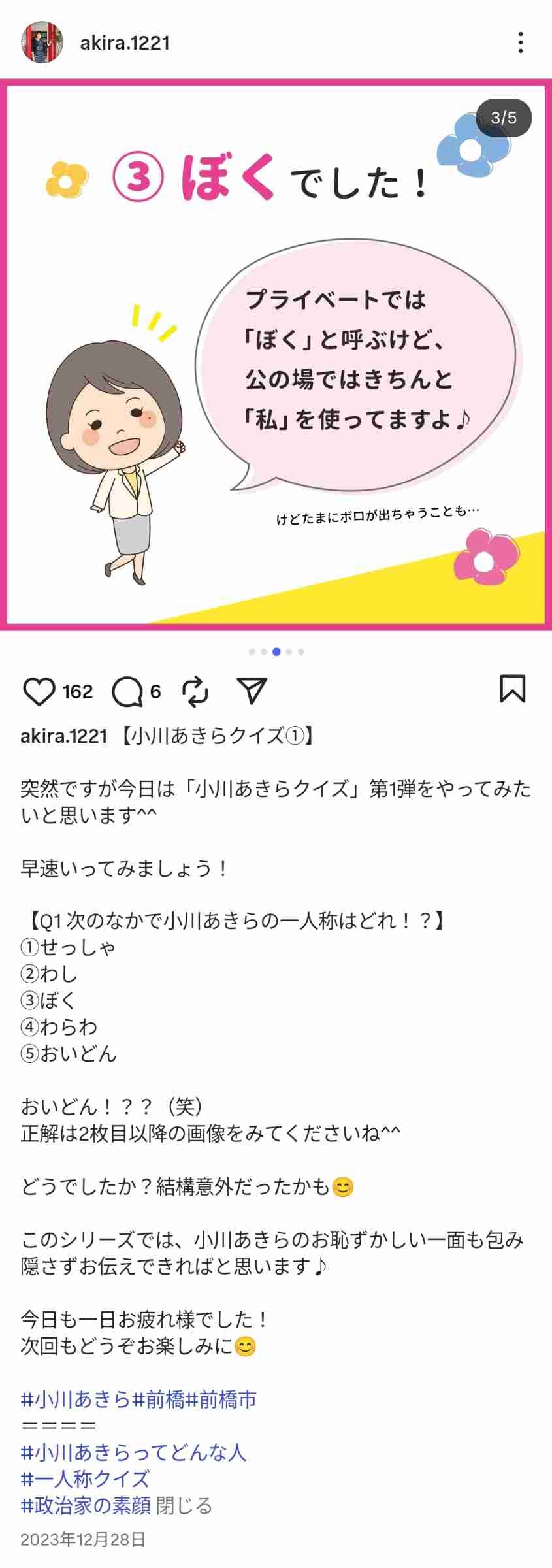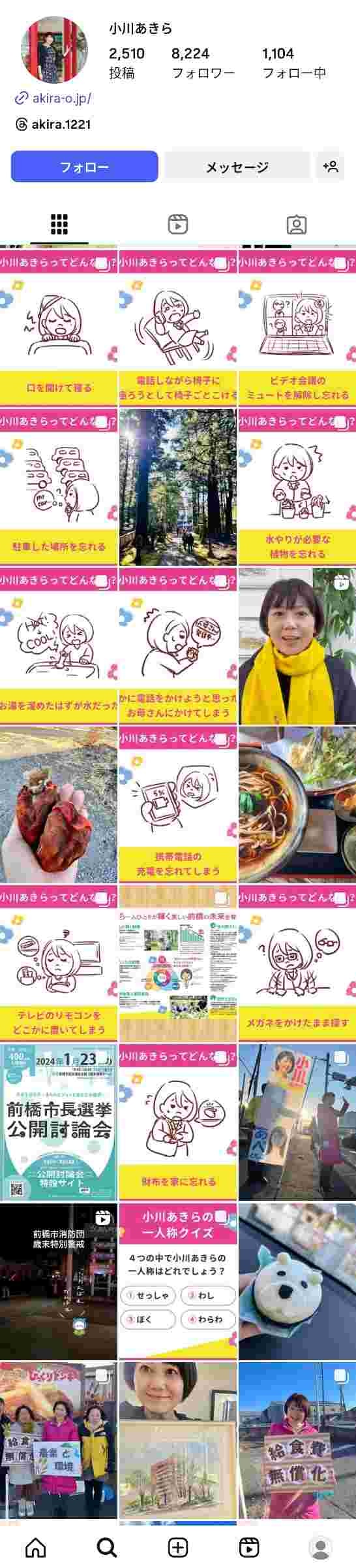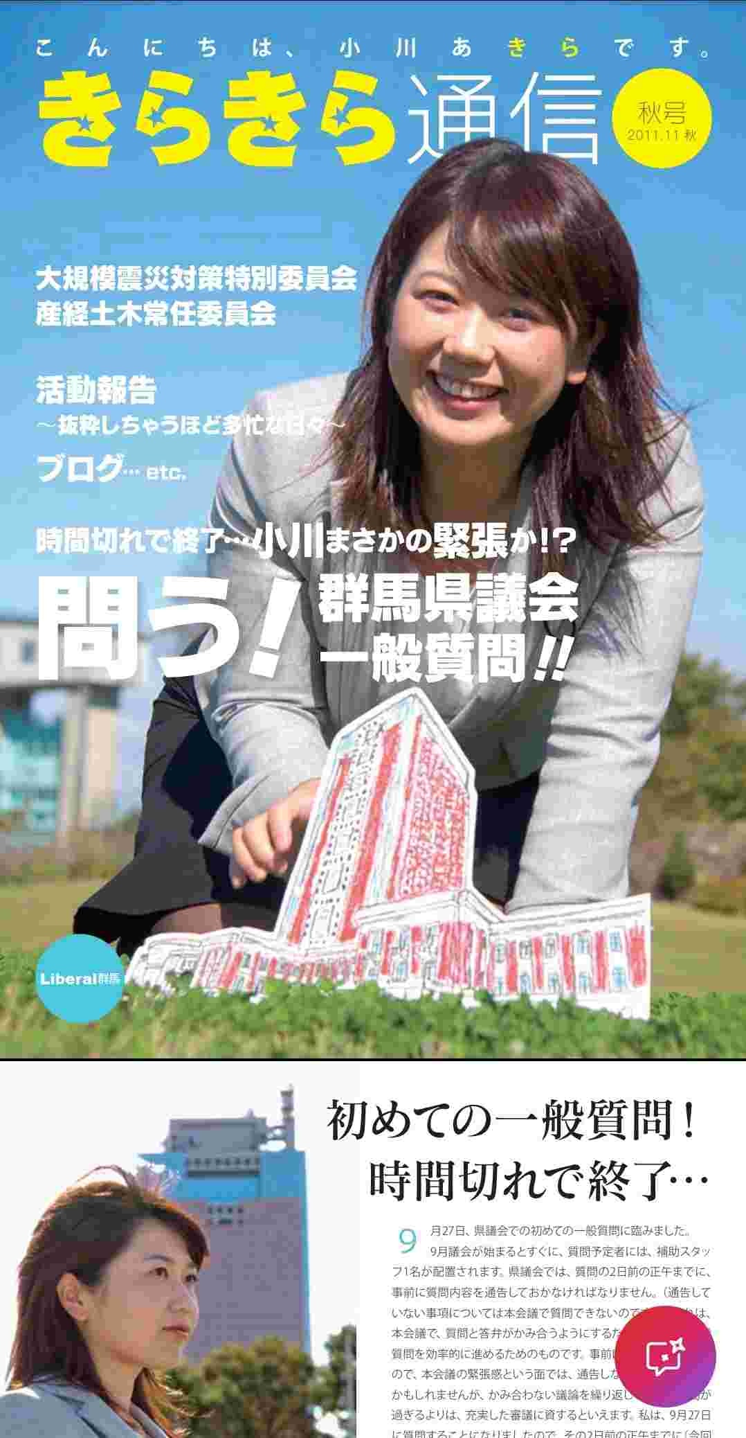 「長澤まさみさん風のショートカットがよく似合い、とても愛嬌のある方です。議員時代、”あきら”という名前に引っ掛けて、『きらきら通信』と題した会報を発行していましたが、表紙はいつも笑顔の小川氏でした。季節に合わせて着物姿を披露してみたり、表紙だけを見ると、往年のアイドル雑誌のような雰囲気です。