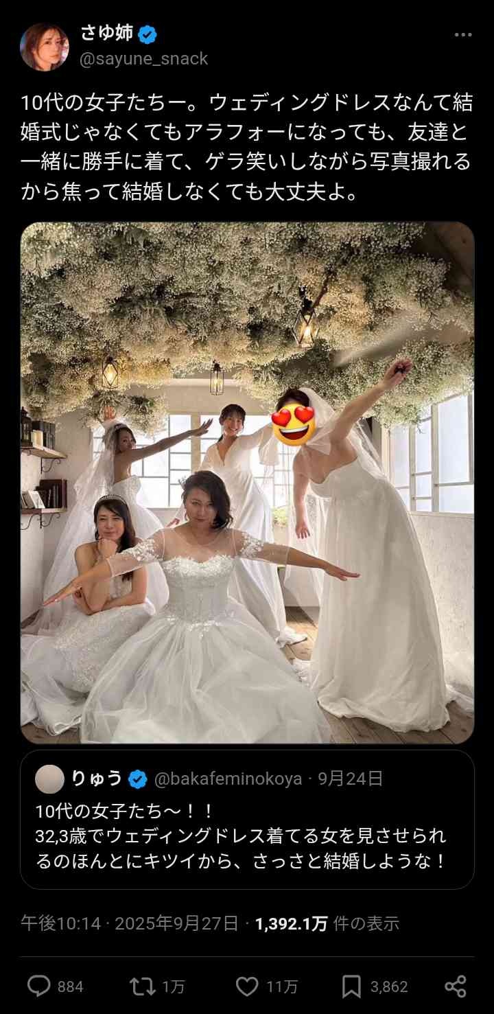 - これさぁ「ウェディングドレス着たいなら誰かに頼らなくても一回自分達で着ちゃうのも良いわよ!良い思い出になるわ!」って投稿ならいい話だったね