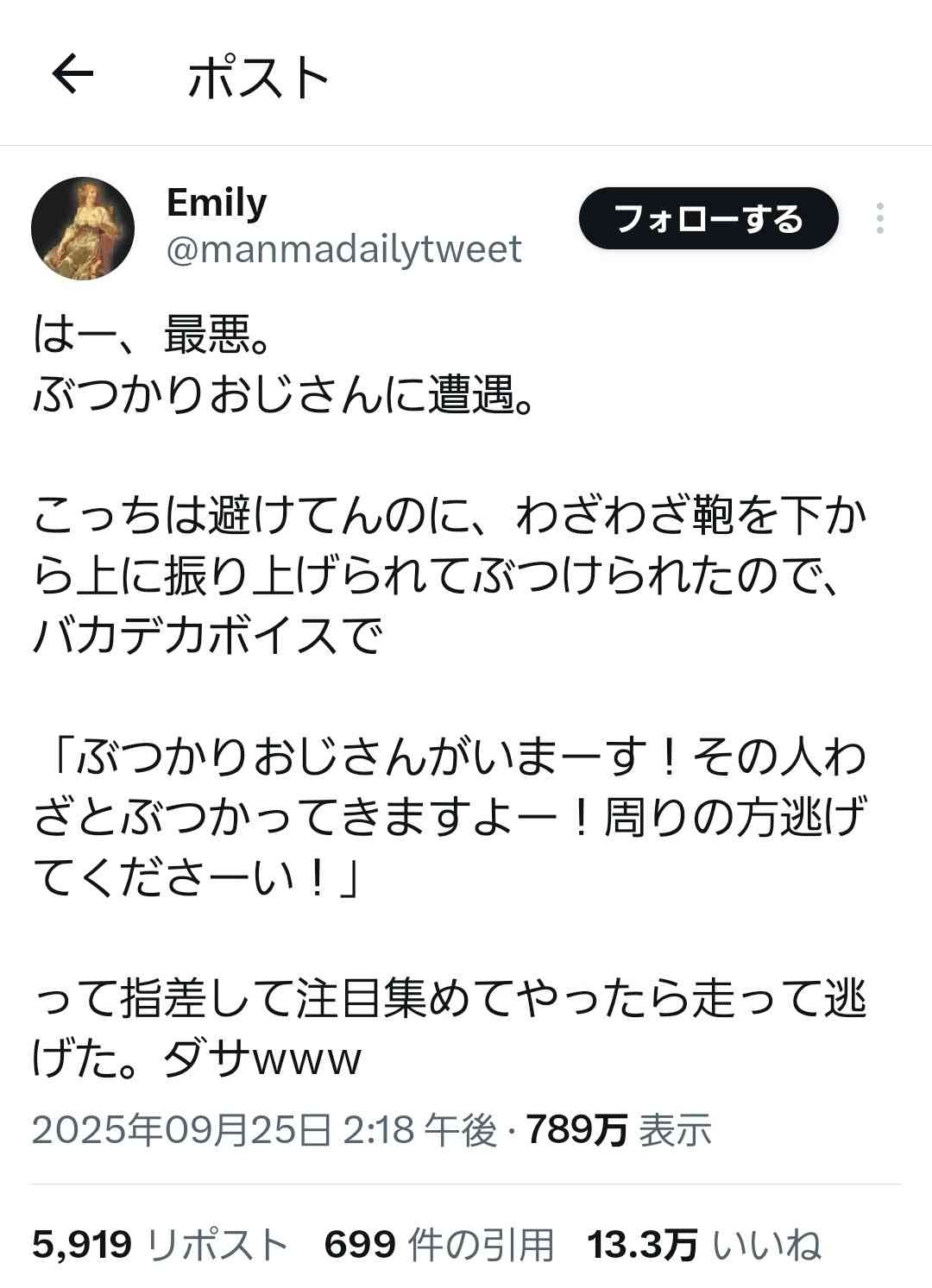 お前ぶつかりおじさんか? - 5 名前:ここからは表現の自由でイカせていただきます 投稿日時:2025/09/30(火) 07:09:52.739 ID:..tI9r2Hv