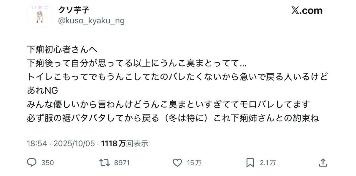 【画像】X民女性「トイレでうんこしてる奴!!!うんこ臭纏いすぎてうんこしてるの周りにバレてるぞ」20万いいね