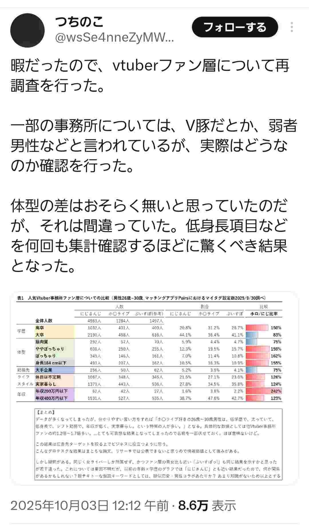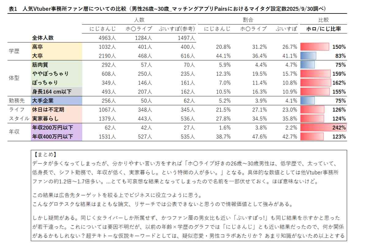 暇だったので、vtuberファン層について再調査を行った。一部の事務所については、V豚だとか、弱者男性などと言われているが、実際はどうなのか確認を行った。
