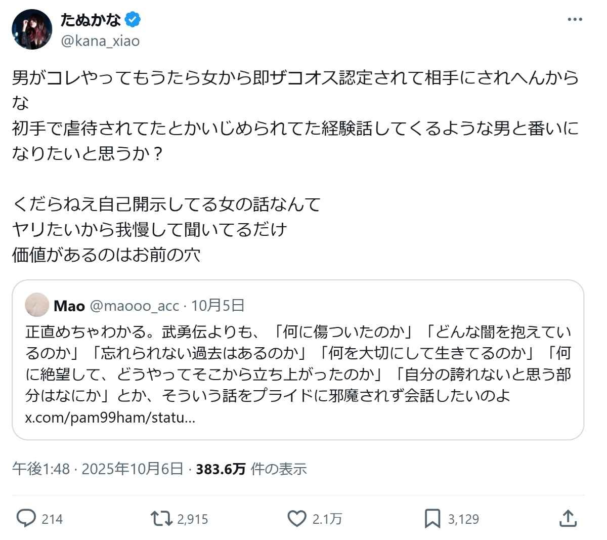 だから自分のことも興味ないだろうから話さない - 11 名前:ここからは表現の自由でイカせていただきます 投稿日時:2025/10/08(水) 15:49:10.526 ID:m9aeFAUCT