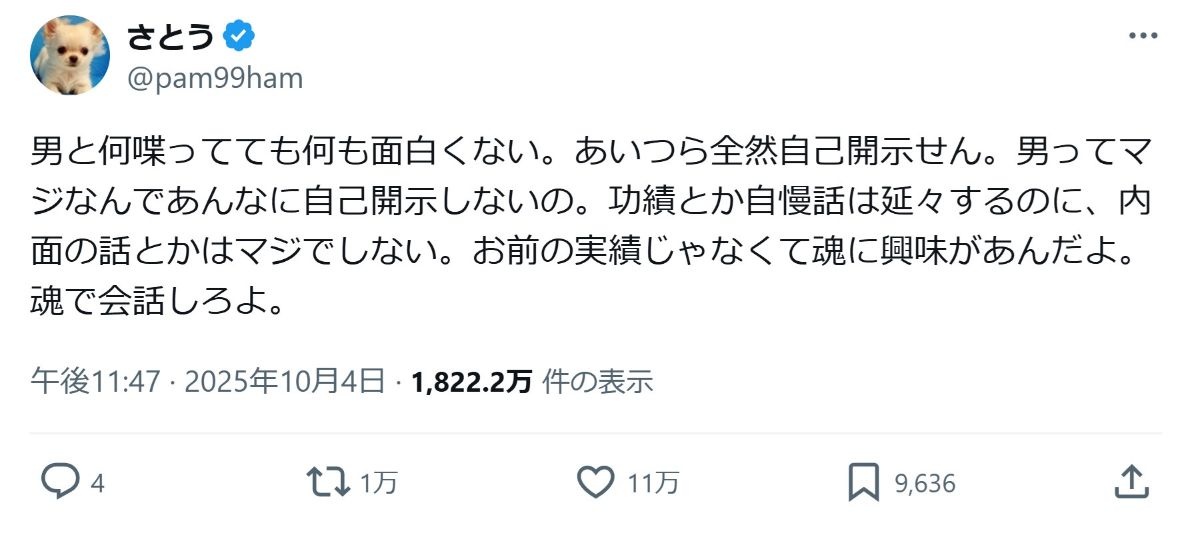- 男って基本的にそういう語るような中身がないし言語化能力もないのよ