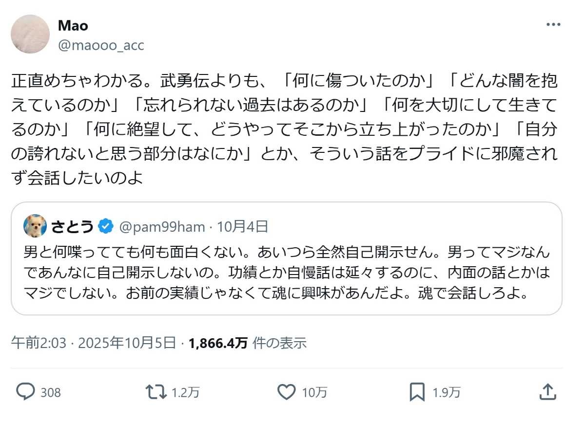 魂の対話が希薄なんよ - 9 名前:ここからは表現の自由でイカせていただきます 投稿日時:2025/10/08(水) 15:48:42.269 ID:8q63dMRht