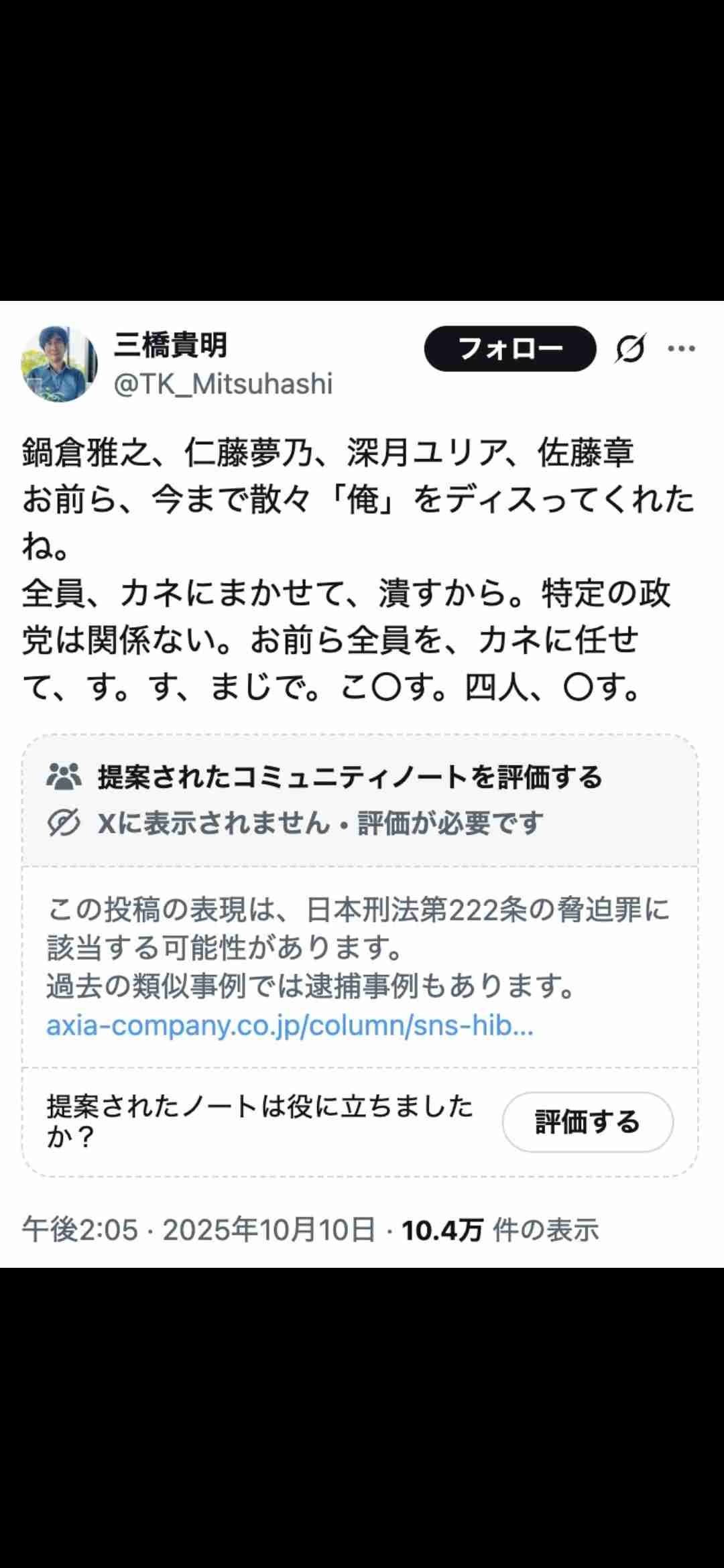 拡声器で一般人脅迫し回ったりとか普通に刑務所に一生入っとくべきカス - 40 名前:ここからは表現の自由でイカせていただきます 投稿日時:2025/10/11(土) 08:36:04.466 ID:i7GDYl8D0