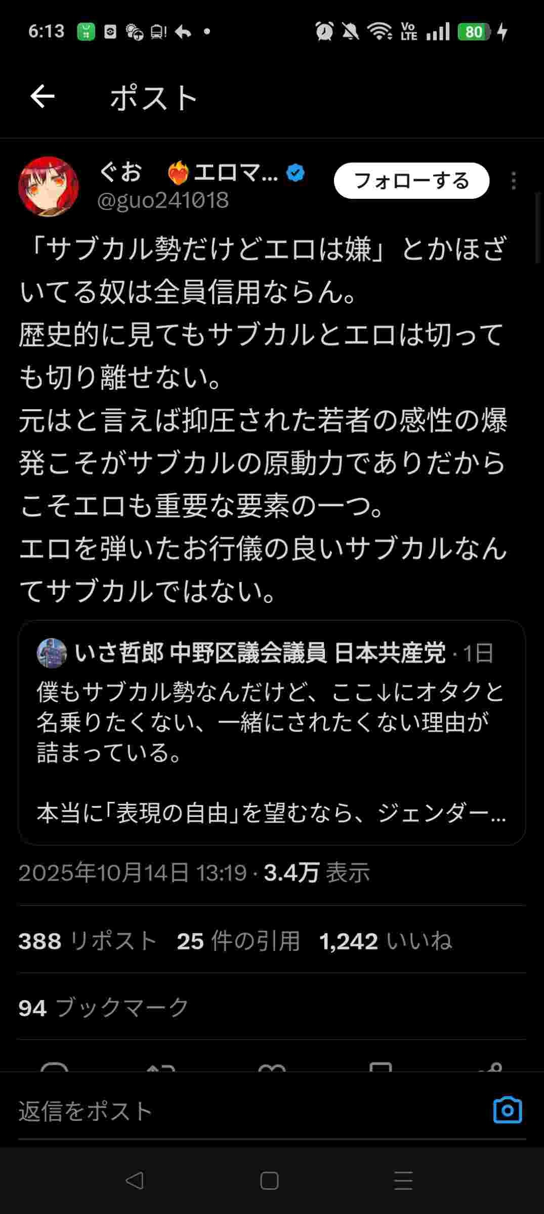いい加減ポルノを守る時にエ口と言い換えるのもポルノ批判してくる人を左翼,フェミ,BL擁護してるってレッテル貼りして叩くの辞めたら?ダサいよ - 18 名前:ここからは表現の自由でイカせていただきます 投稿日時:2025/10/15(水) 06:28:05.122 ID:g4vbBH.7e
