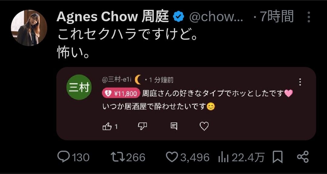 日本人男性「可愛い♥�酔わせちゃいたい💴(11800円スパチャ)」YouTuber美女「これセクハラですよ。怖い」