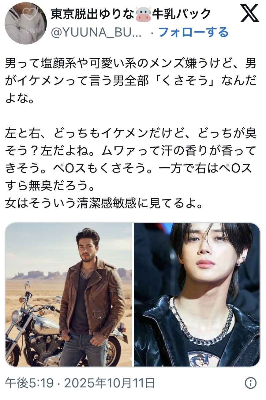 青髭あるだけでイケメンから外されるレベル - 48 名前:ここからは表現の自由でイカせていただきます 投稿日時:2025/10/18(土) 23:55:21.215 ID:6HPTnLZtx