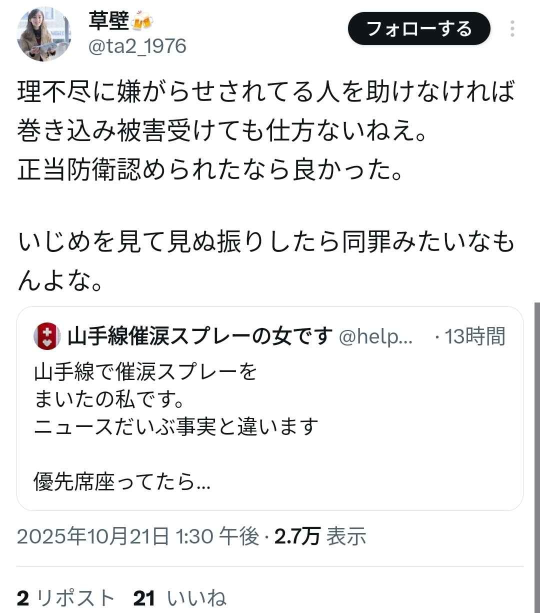 山手線催涙スプレー女性さん、ツイッターに降臨www ツイッタラー「スプレーをかけられたほうが悪い」の意見が圧倒的