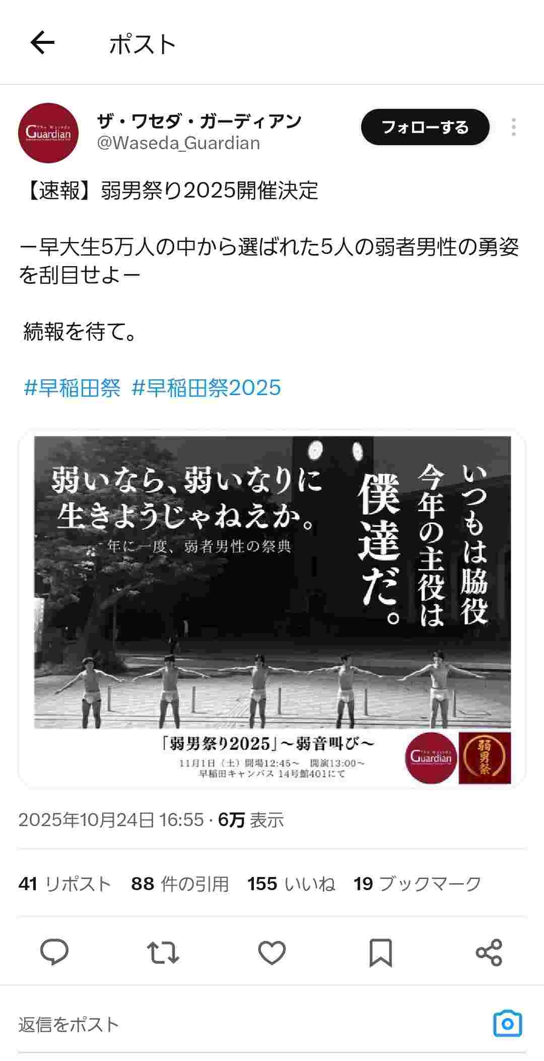 早稲田の学祭で「弱者男性祭り」が開催される!!本物の弱者早稲生しか参加出来ない。
