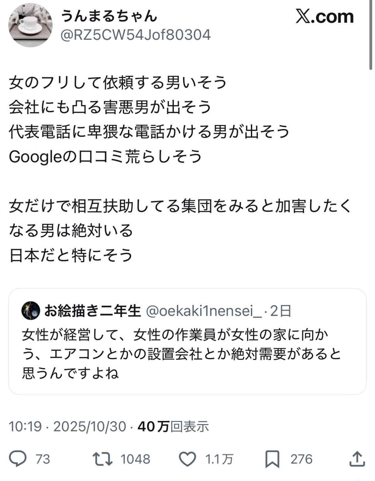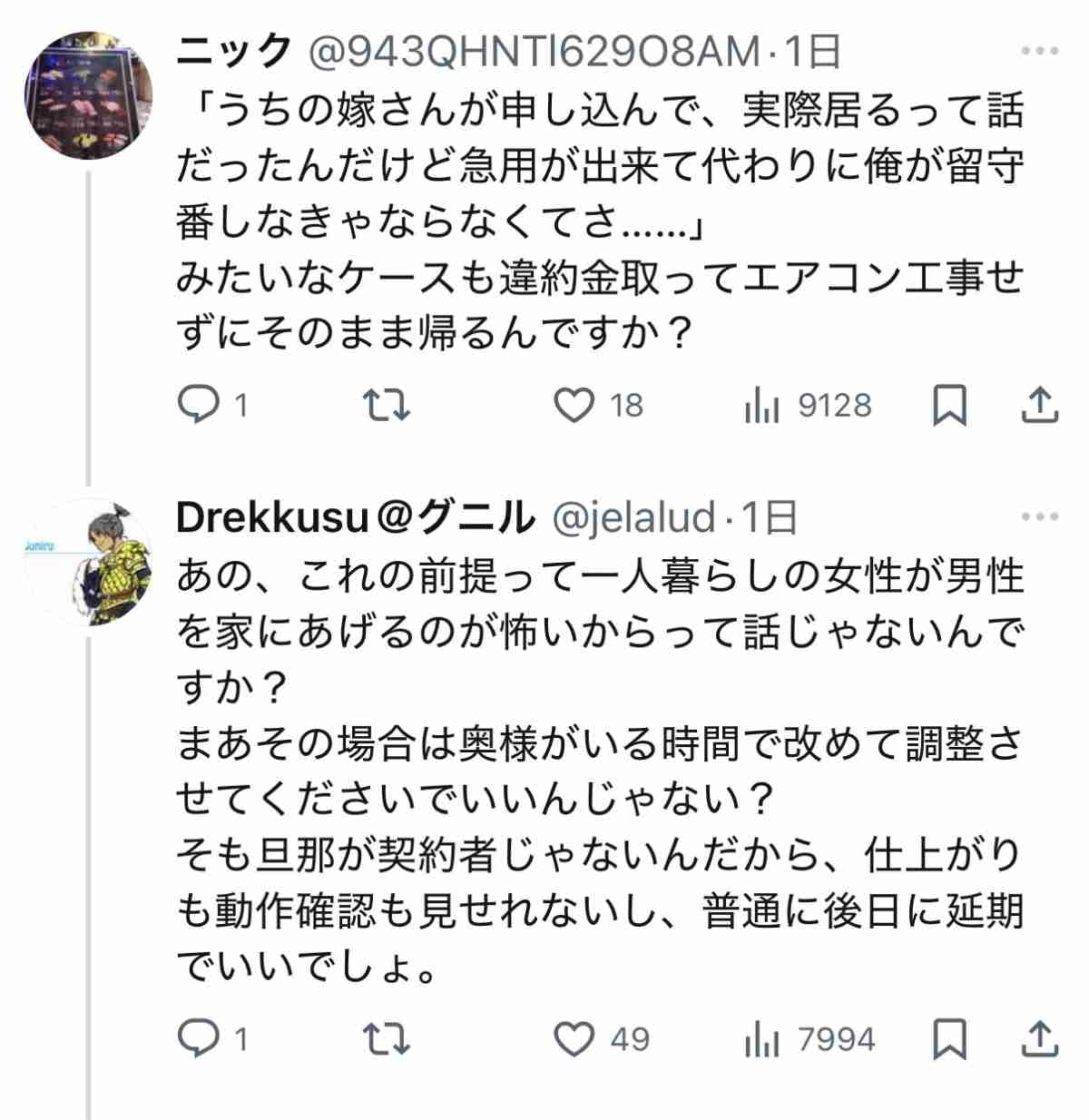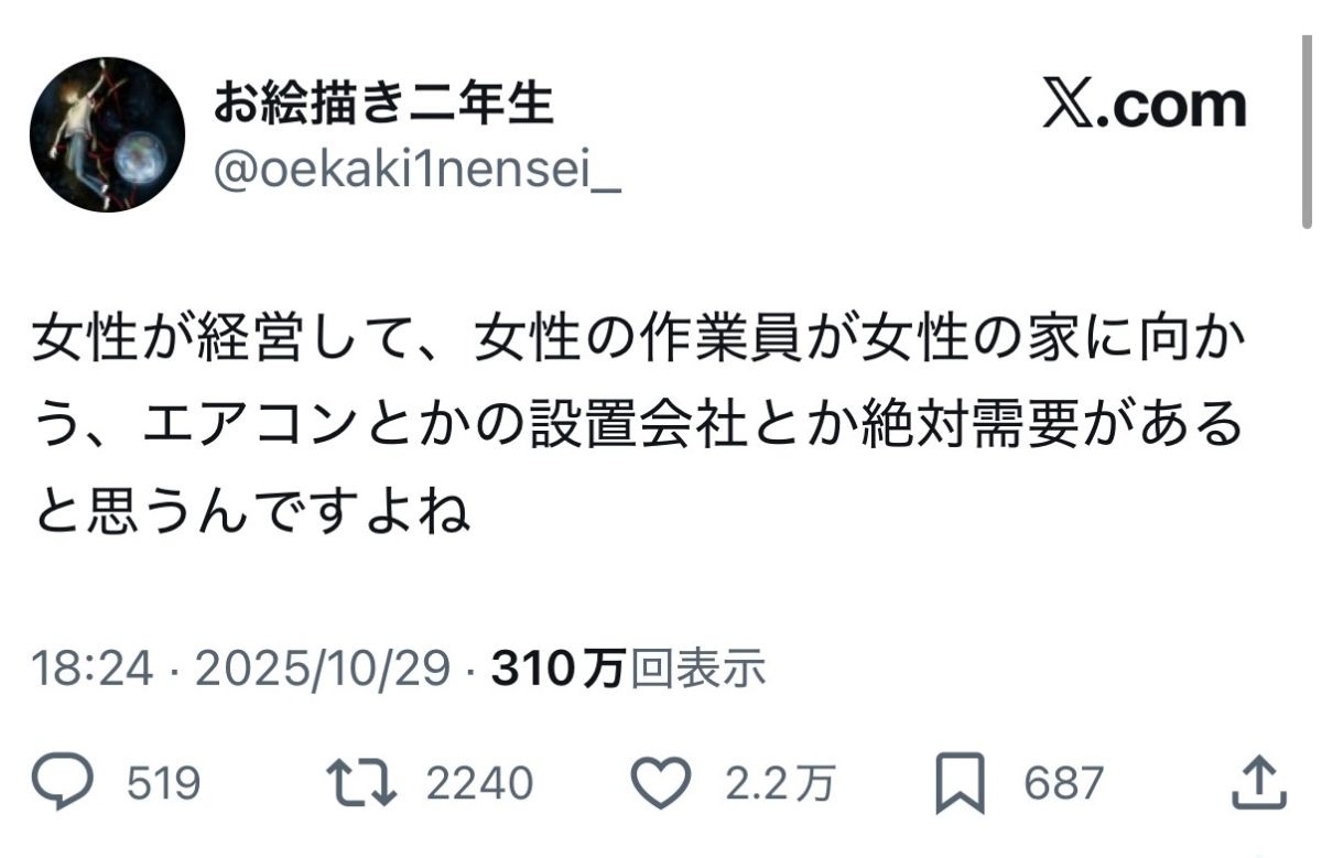 女性「女だけのエアコン設置業者とか需要あるよね」👩「でもさあ!!!」