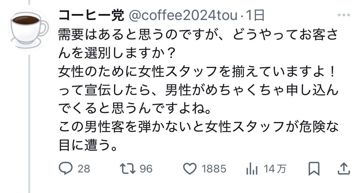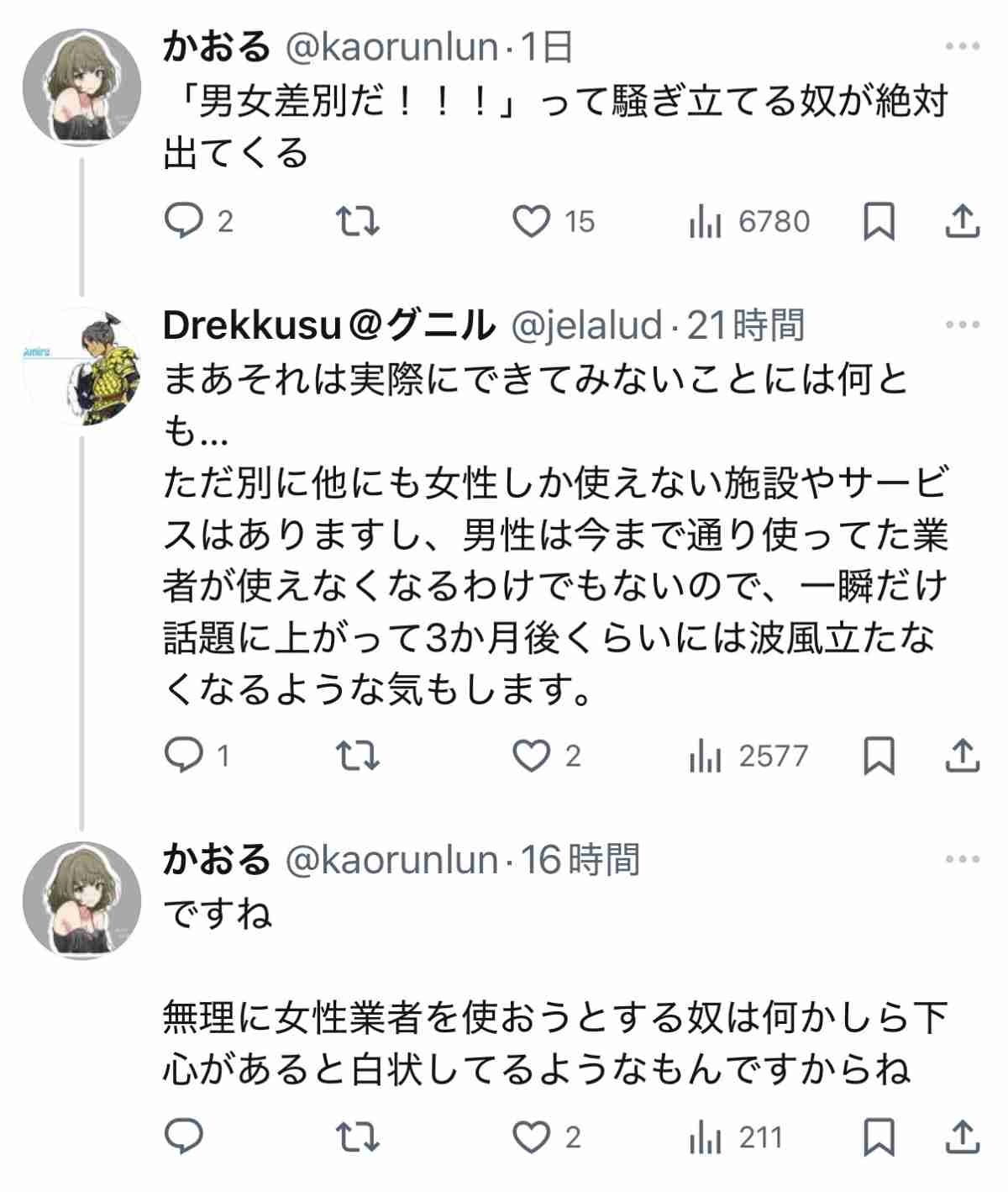 - 顧客が1/2になるから価格を2倍にしないといけないがそんな金払ってまで男を家に上げたくないミサンドリストは多くないんよな