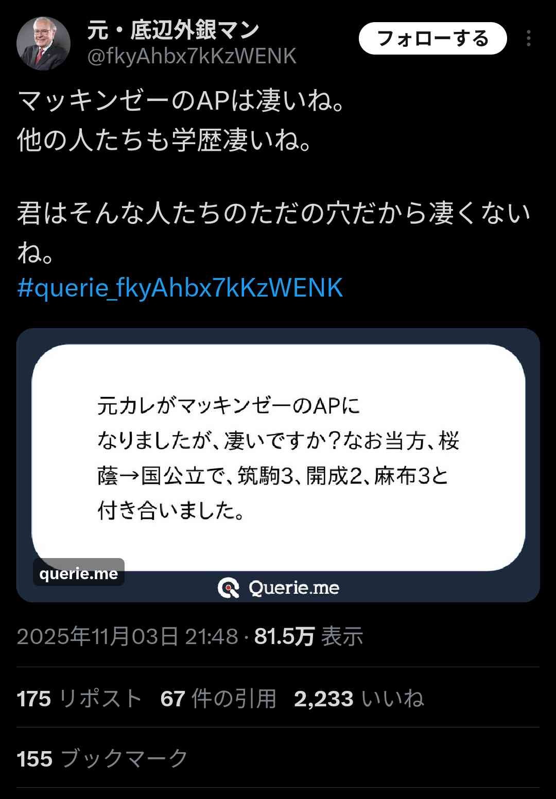 そこら辺の人達なんやろ - 56 名前:ここからは表現の自由でイカせていただきます 投稿日時:2025/11/07(金) 08:41:37.618 ID:b081iKHPE