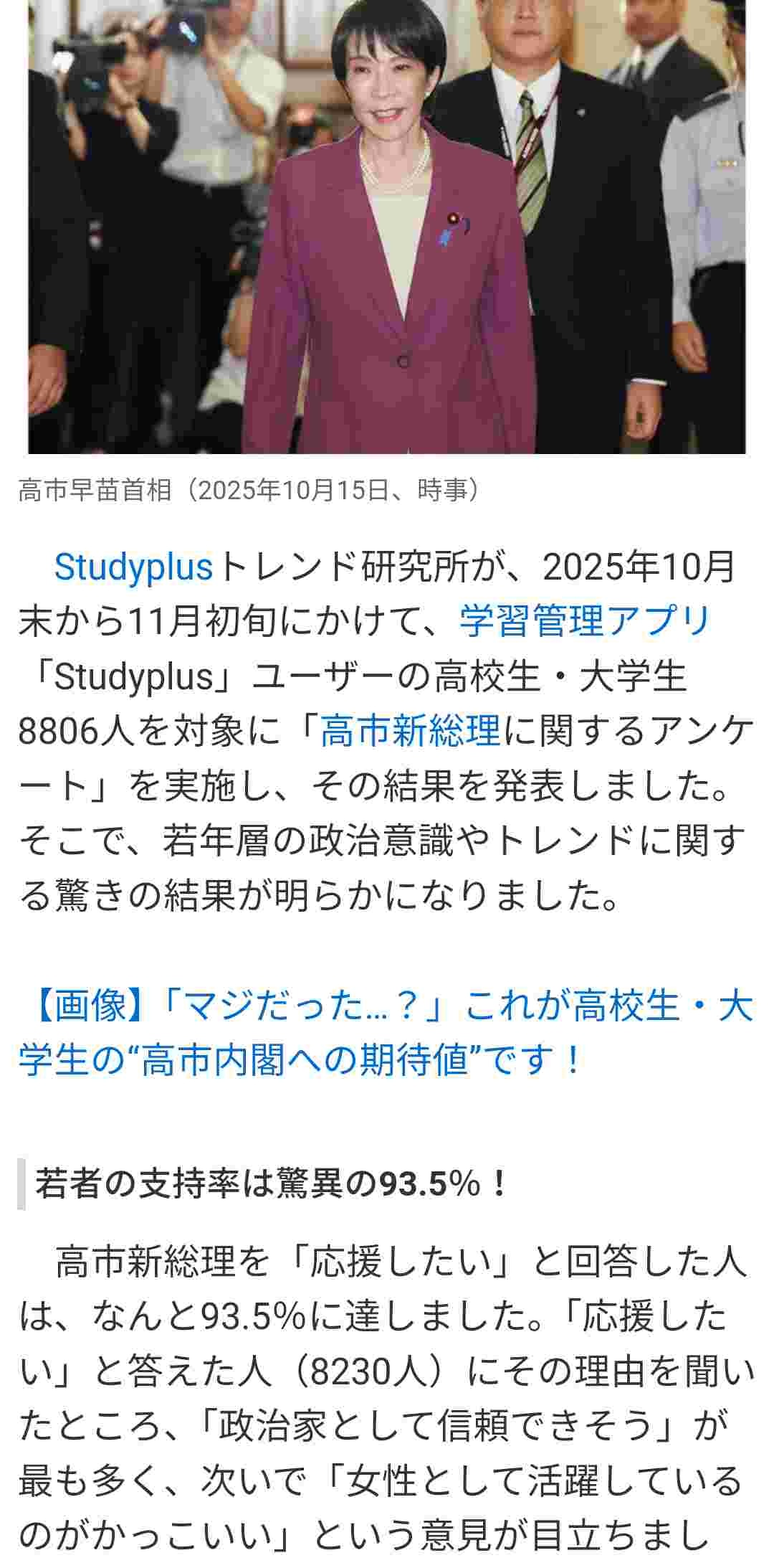 高市早苗さん、支持率93%wwwチョンモメンまた自殺へwww