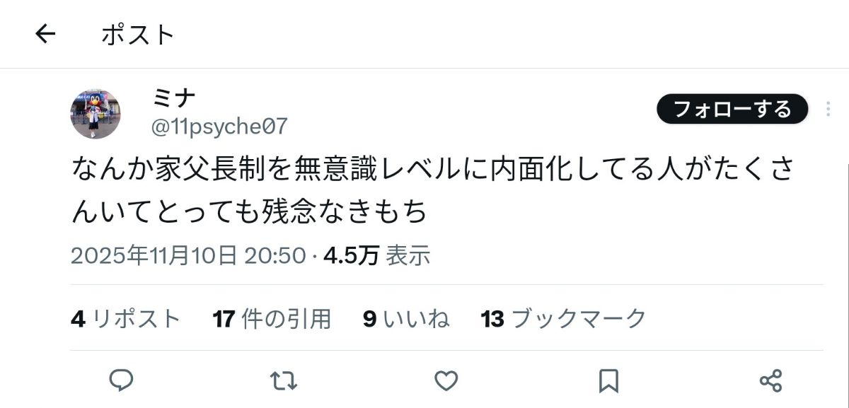 - 批判後の反応「家父長制を無意識に内面化してる人が多くて残念」