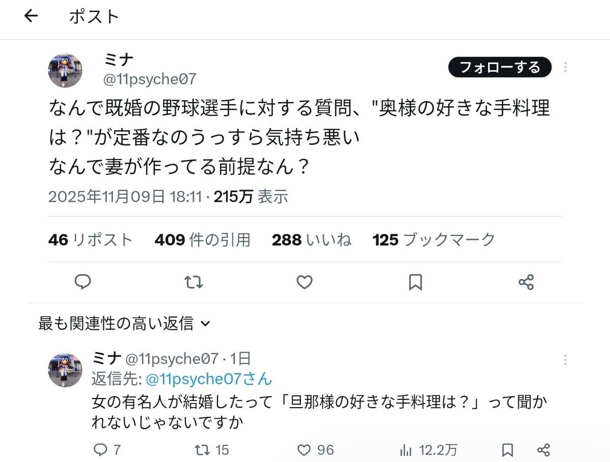 野球ファンのまんさん「なんで既婚の野球選手には『好きな奥様の料理は?』って聞くの?選手が飯作ってるかもしれないだろ」