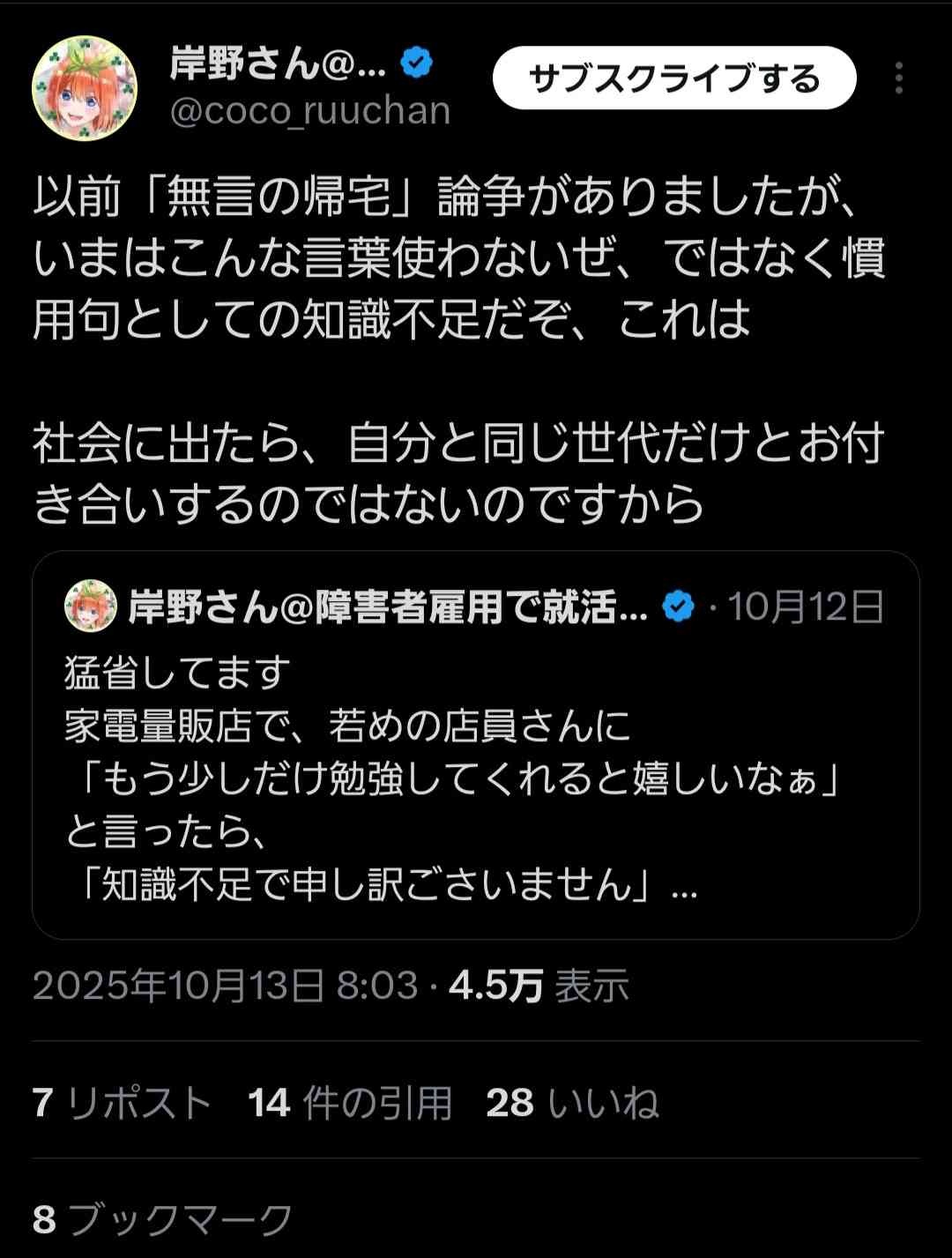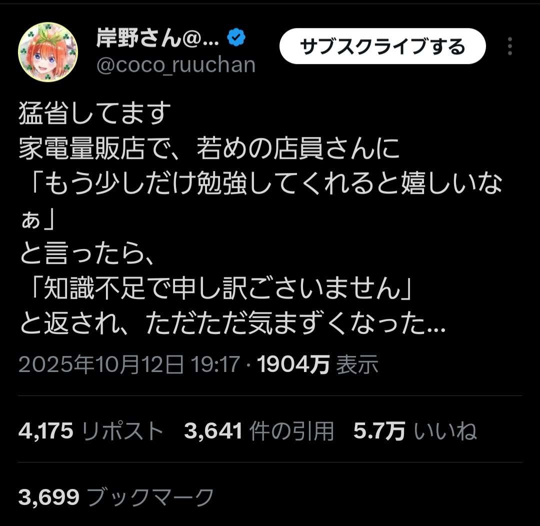 - 「猛省してます。家電量販店で、若めの店員さんに 「もう少しだけ勉強してくれると嬉しいなぁ」と言ったら、「知識不足で申し訳ございません」と返され、ただただ気まずくなった…」